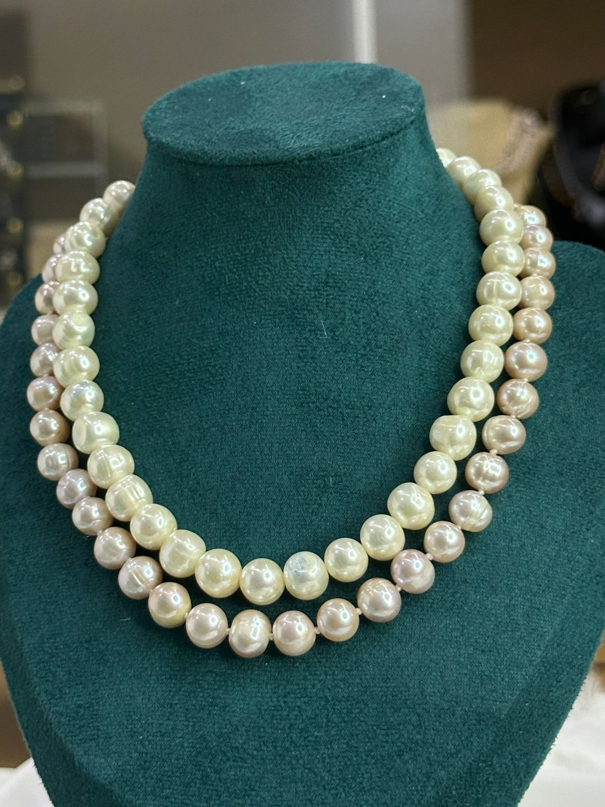 Luxurious two-layer freshwater pearl necklace featuring high-quality pearls in beautiful natural White & Purple tones. inches long. A classic, high-luster piece that promises exceptional quality.