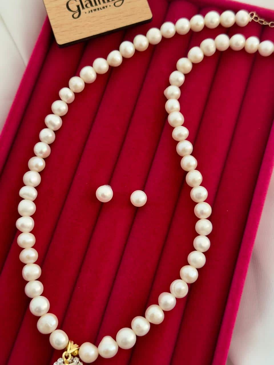 This necklace comes with matching pearl stud earrings, completing a graceful and balanced set. Whether paired with saree, salwar kameez, gown, or office attire, this pearl set adds instant elegance to any outfit.