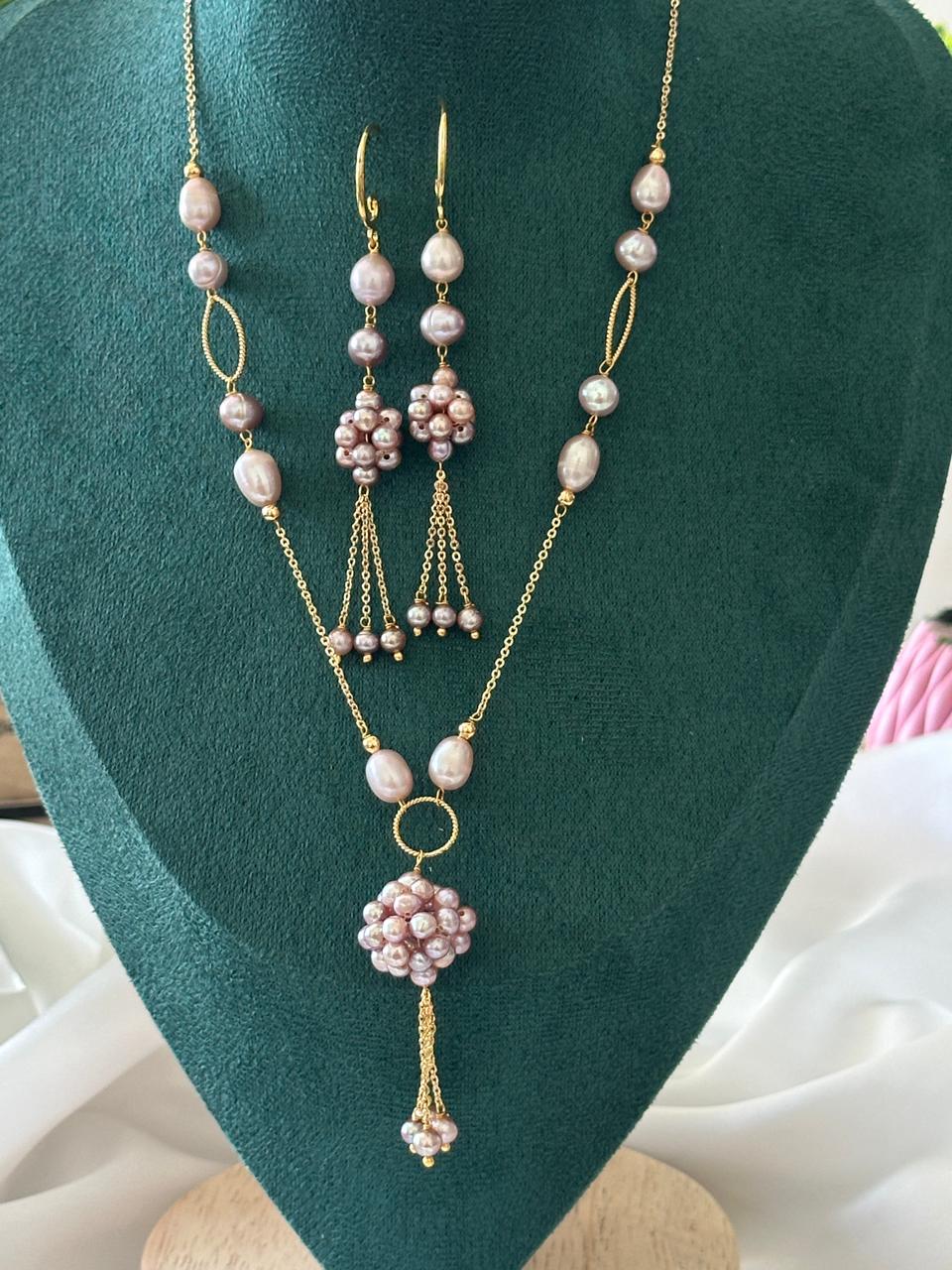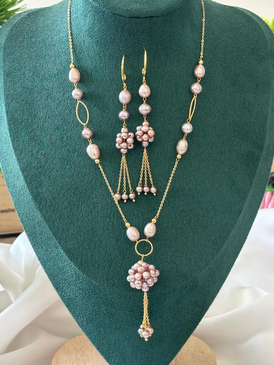 • Design: Intricate long-line necklace with a pearl cluster pendant and matching tassel drop earrings.