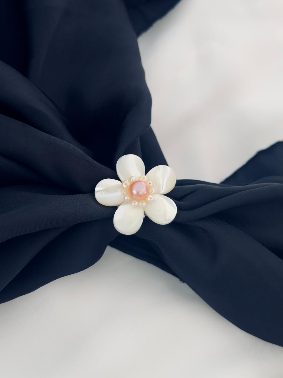 At the center sits a natural freshwater pearl, carefully selected for its shine and smooth surface, adding a refined and luxurious touch. The floral design makes it a standout accessory for both traditional and modern outfits.