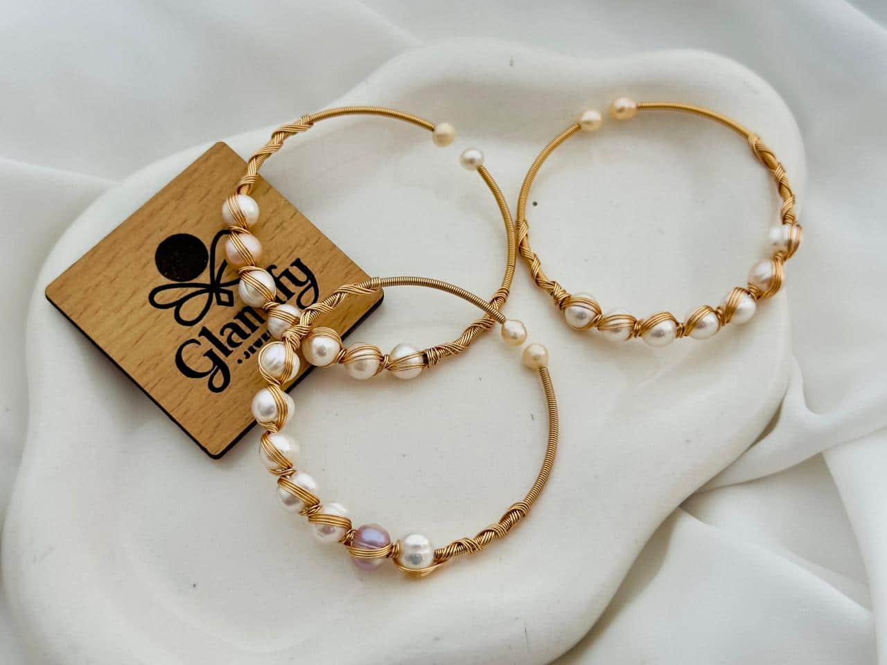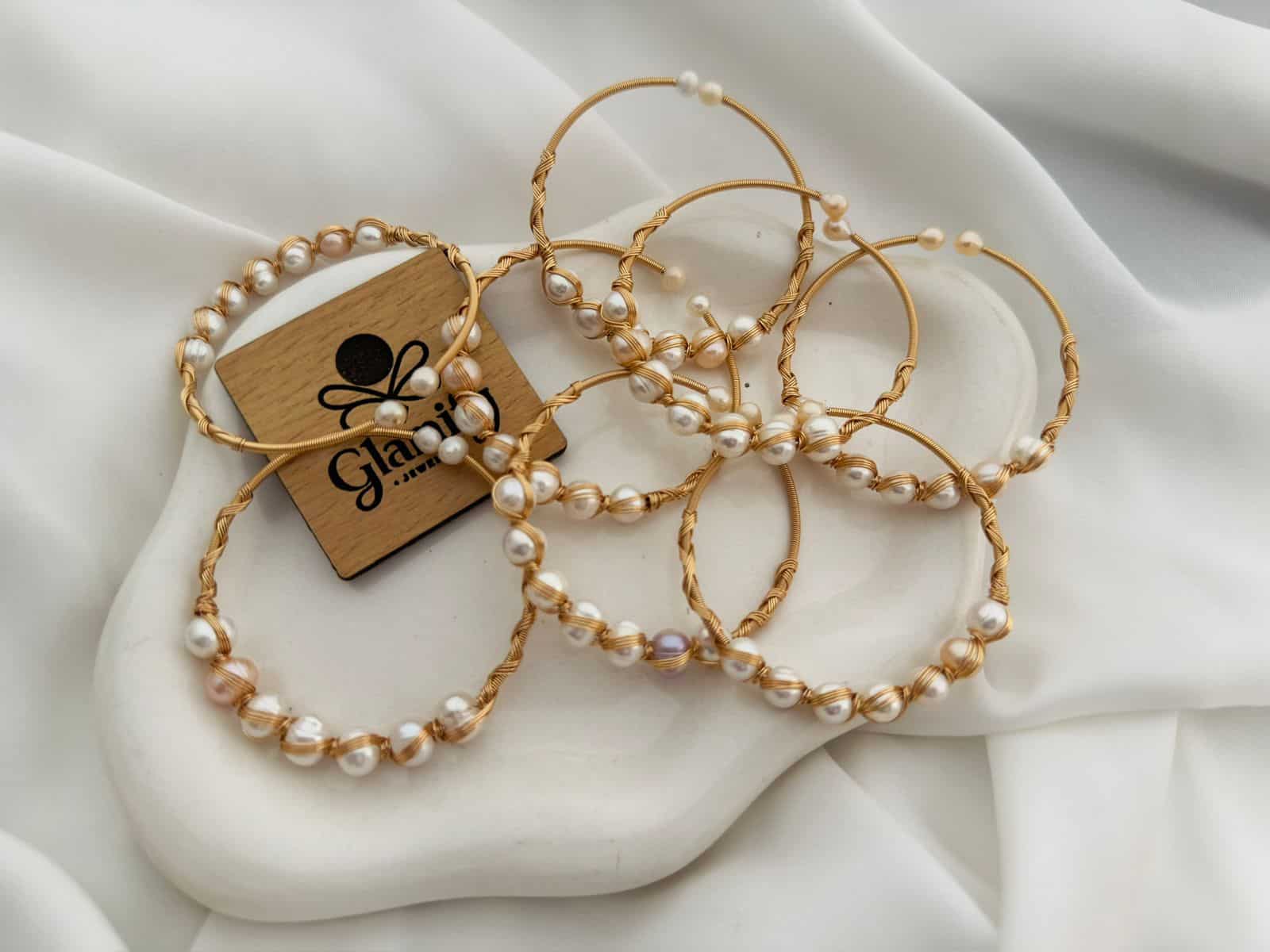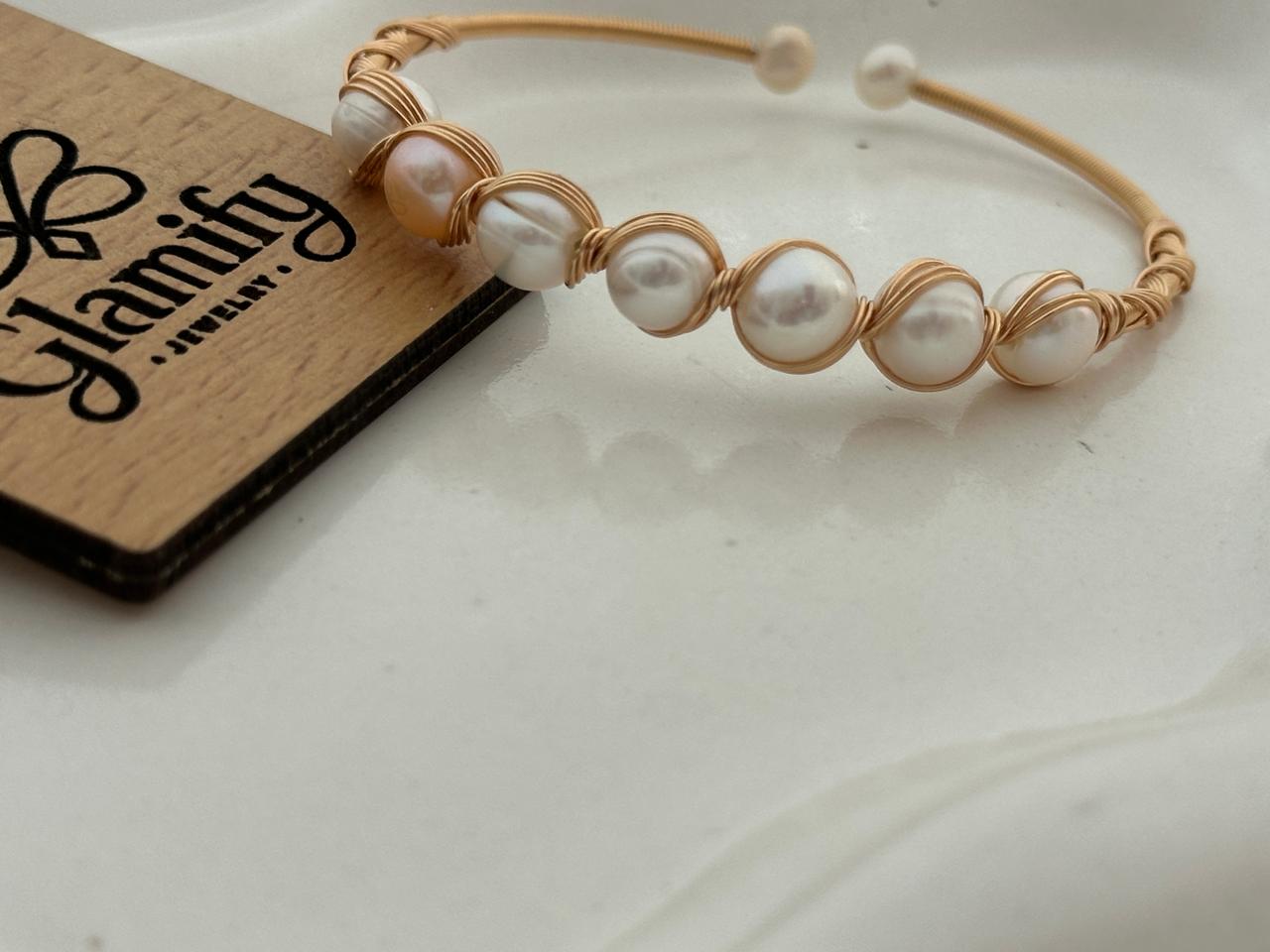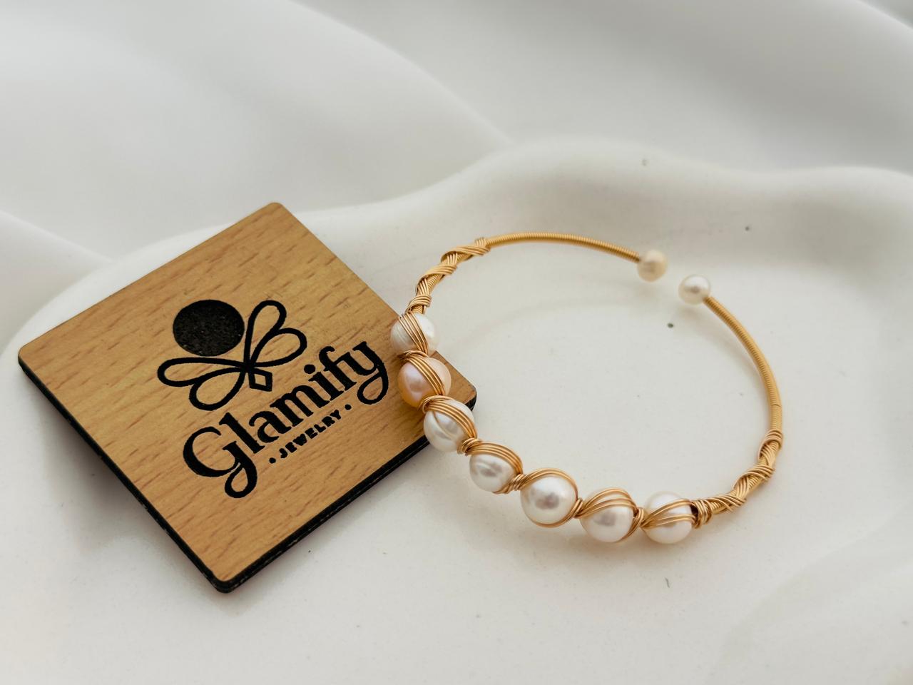 The pearls are artistically wrapped with premium gold wire detailing, creating a sophisticated and contemporary look. The adjustable open bangle style ensures a comfortable and secure fit for different wrist sizes, making it easy to wear throughout the day.