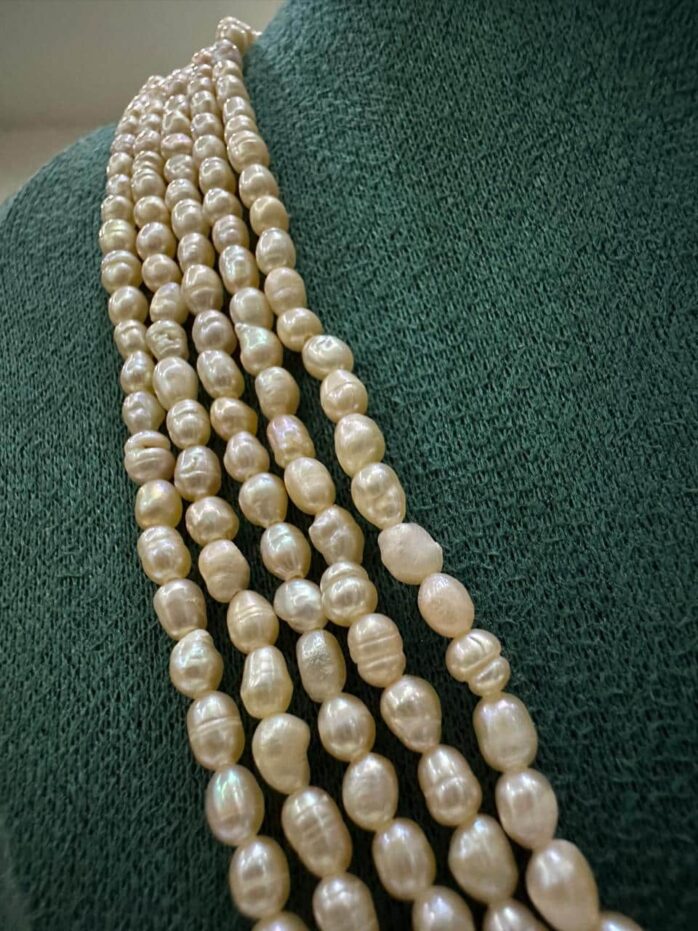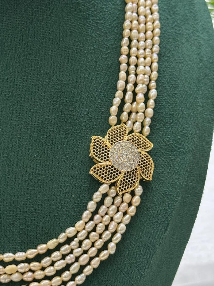 This 5 layer pearl necklace is crafted with premium 4mm freshwater rice pearls in a soft pink tone, giving it a graceful and feminine appearance. The layered design adds volume and richness, making it perfect for special occasions and traditional outfits.