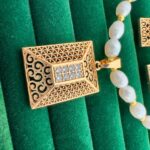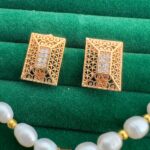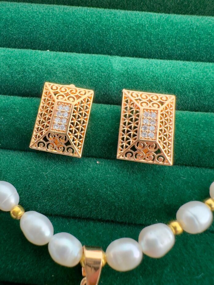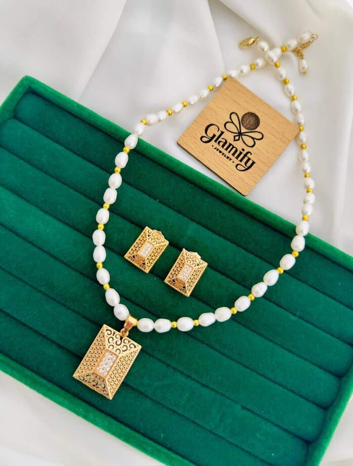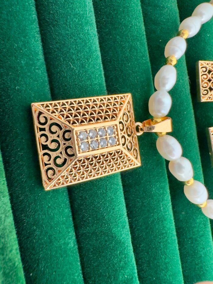 The highlight of this set is its premium square designer locket. Crafted with intricate filigree pattern work and finished in a rich gold tone, the locket features subtle crystal stone detailing at the center, adding a touch of sparkle without overpowering the elegance of the pearls. Matching gold-tone earrings complete the set, making it ready to wear for any occasion.