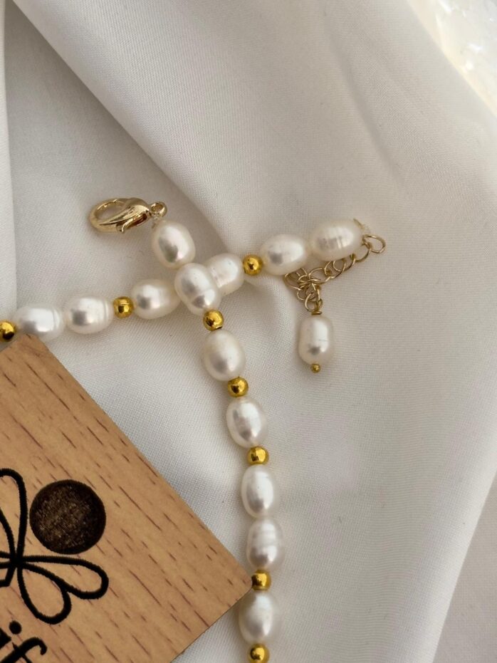 The 17-inch necklace sits perfectly around the neckline and comes with an adjustable chain to ensure a comfortable fit for different sizes. The combination of bright white pearls and gold beads creates a sophisticated style that complements both traditional and modern outfits.