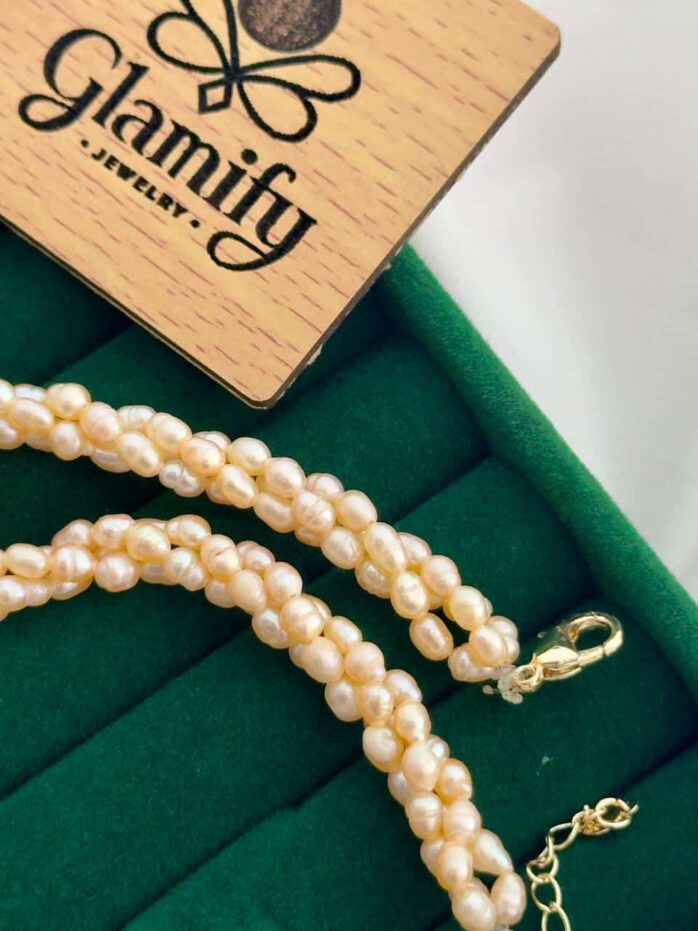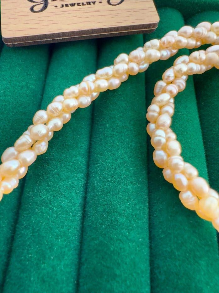 The 3–4mm pink freshwater rice pearls are carefully selected for their smooth surface and natural glow. The twisted 3-layer arrangement gives a fuller and more luxurious appearance while remaining lightweight and comfortable for all-day wear.