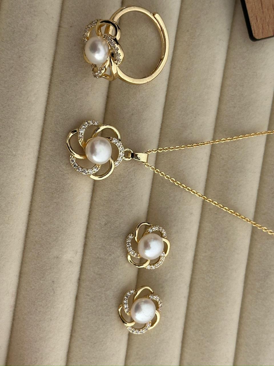 The floral-inspired design is beautifully finished with premium gold plating and delicately embedded shimmering stones that enhance the brilliance of the pearl. The warm golden tone perfectly complements the soft white pearl, creating a luxurious and graceful look.