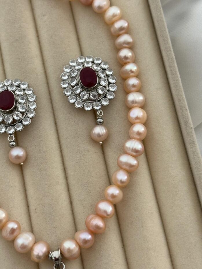 AAA Grade Pink Freshwater Pearl Necklace Set with Ruby Stone Pendant – 7-8mm | 17 Inch Adjustable