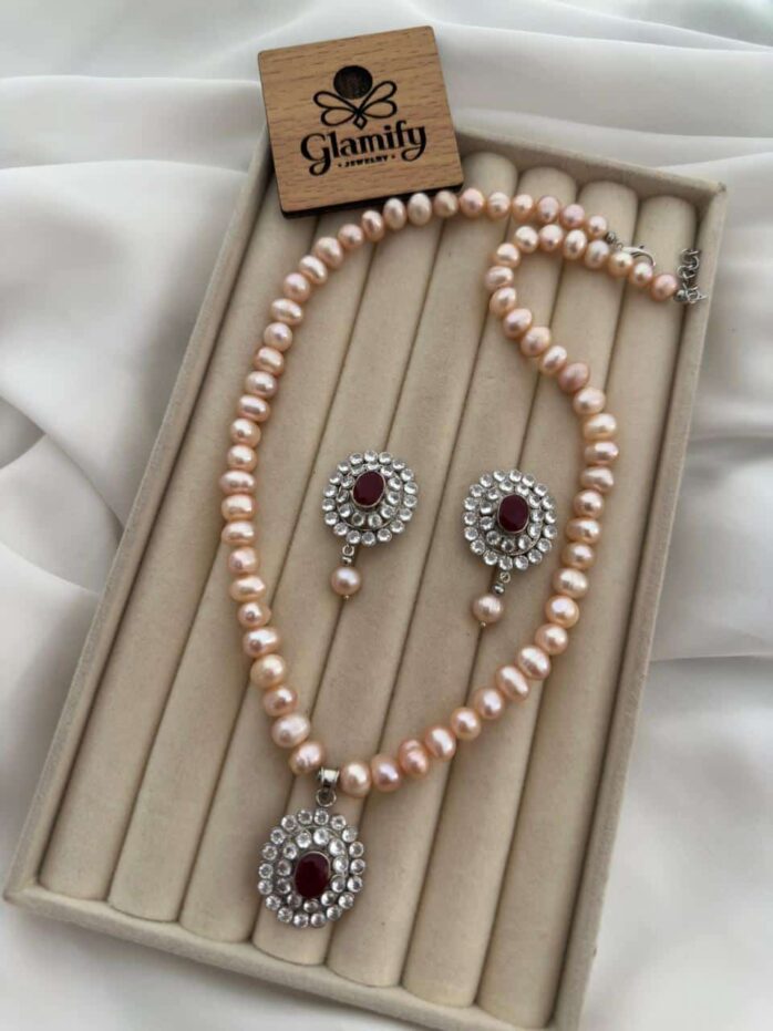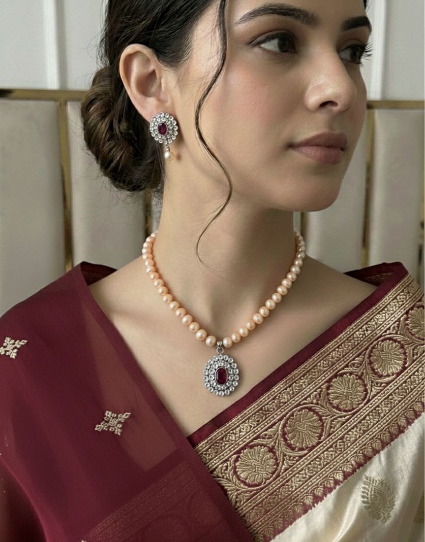 A graceful blend of soft pink pearls and bold ruby elegance — designed to make you stand out.