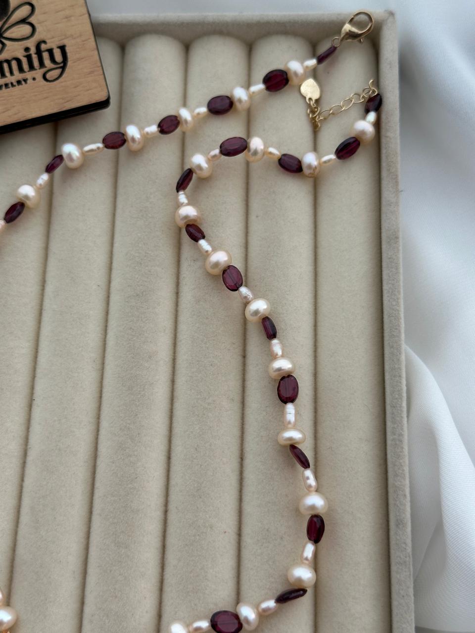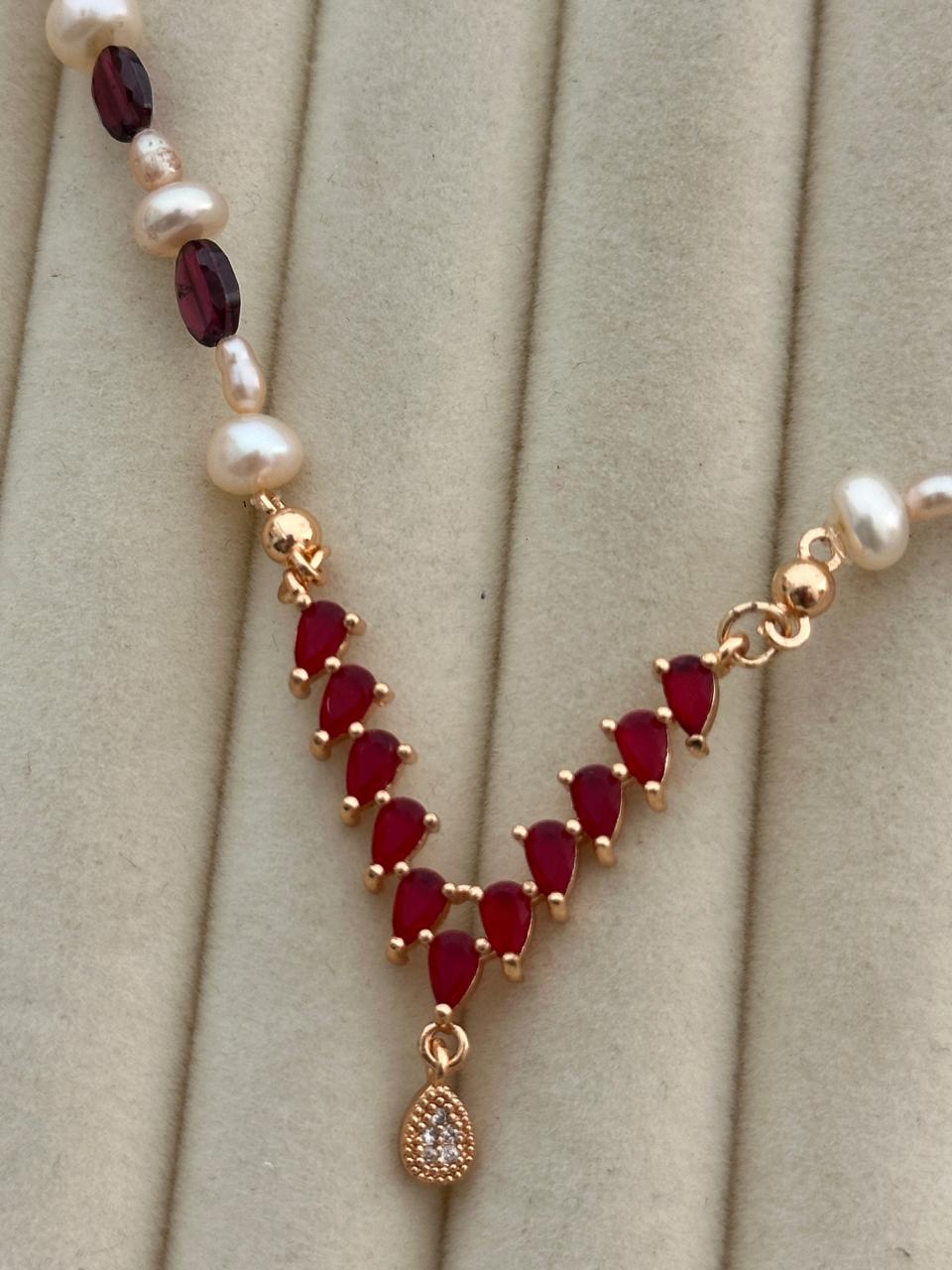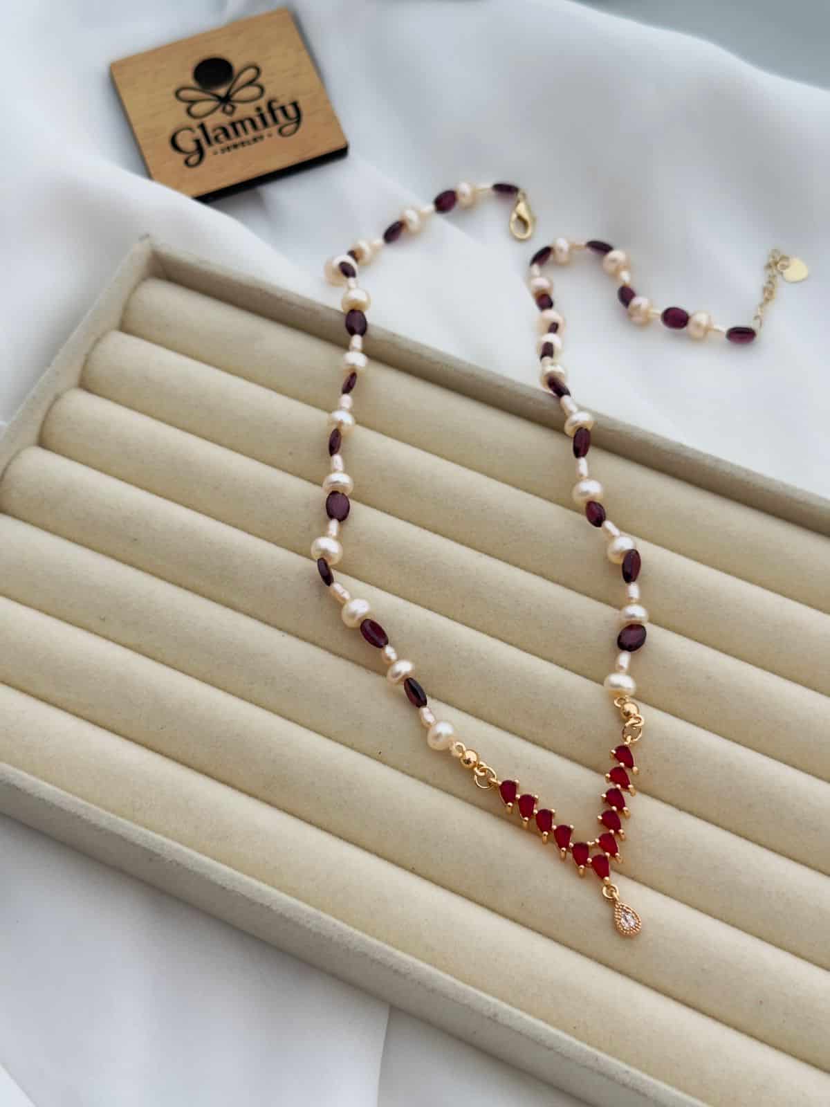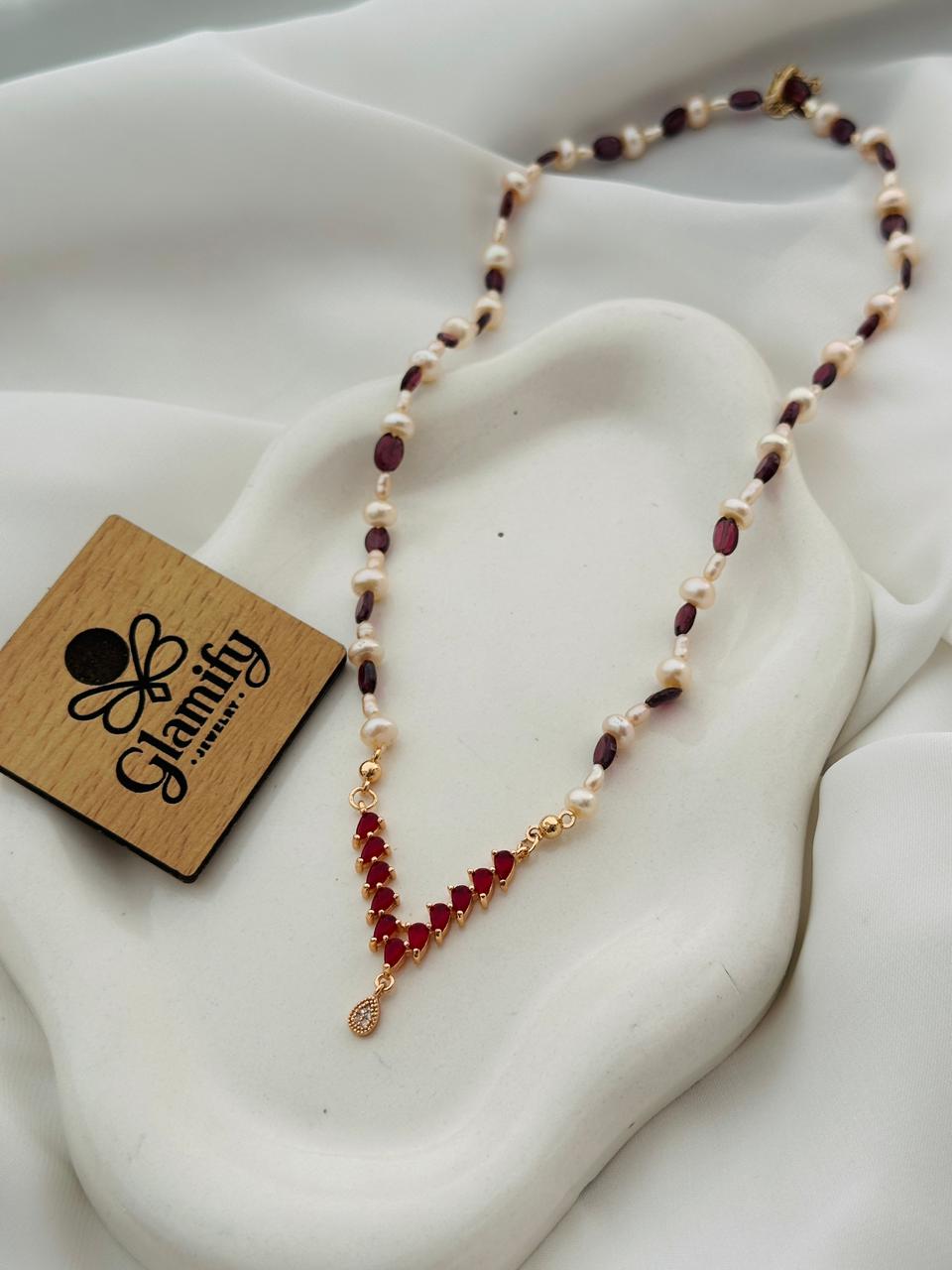 The necklace features 6MM and 3MM pearls arranged carefully to enhance texture and dimension. The ruby stone accents add a bold contrast, while the ruby pendant at the center creates a refined focal point that instantly elevates your look.