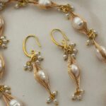 This stunning set features 7–8mm premium freshwater rice pearls, carefully selected for their smooth surface and radiant natural luster. Each pearl is artistically wrapped in hand-woven gold wire, creating a sophisticated and luxurious textured finish.