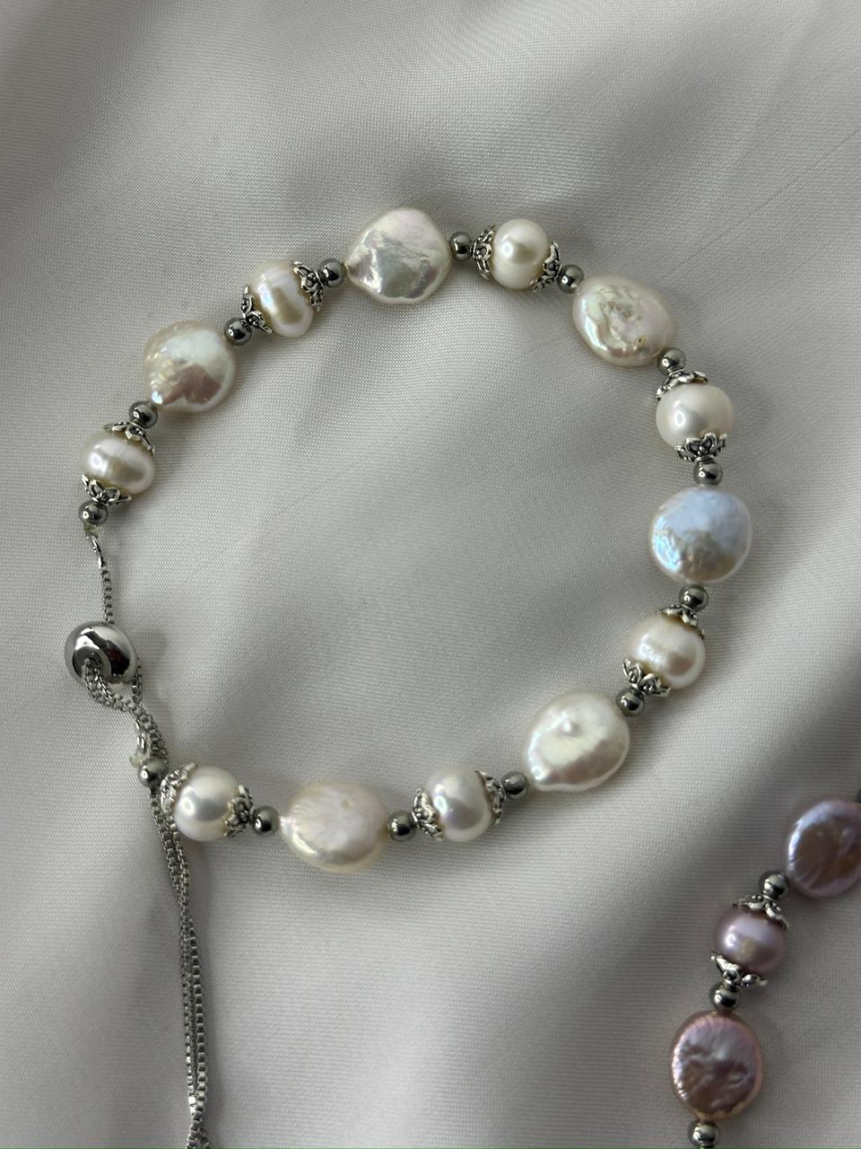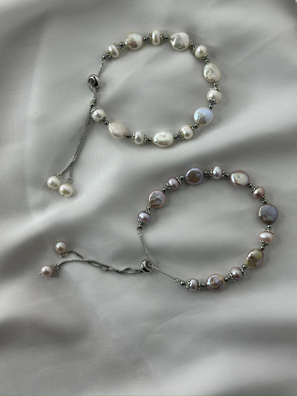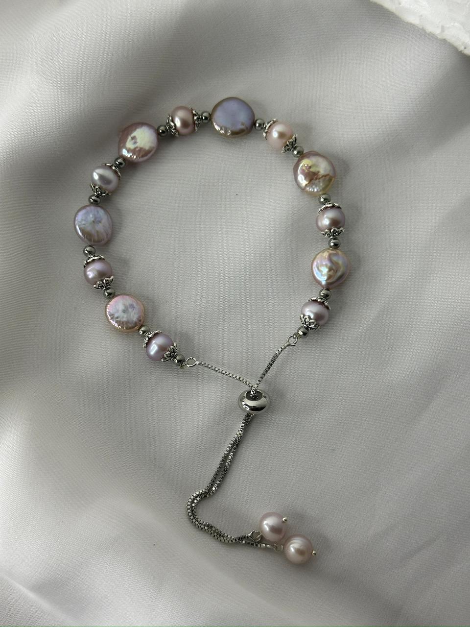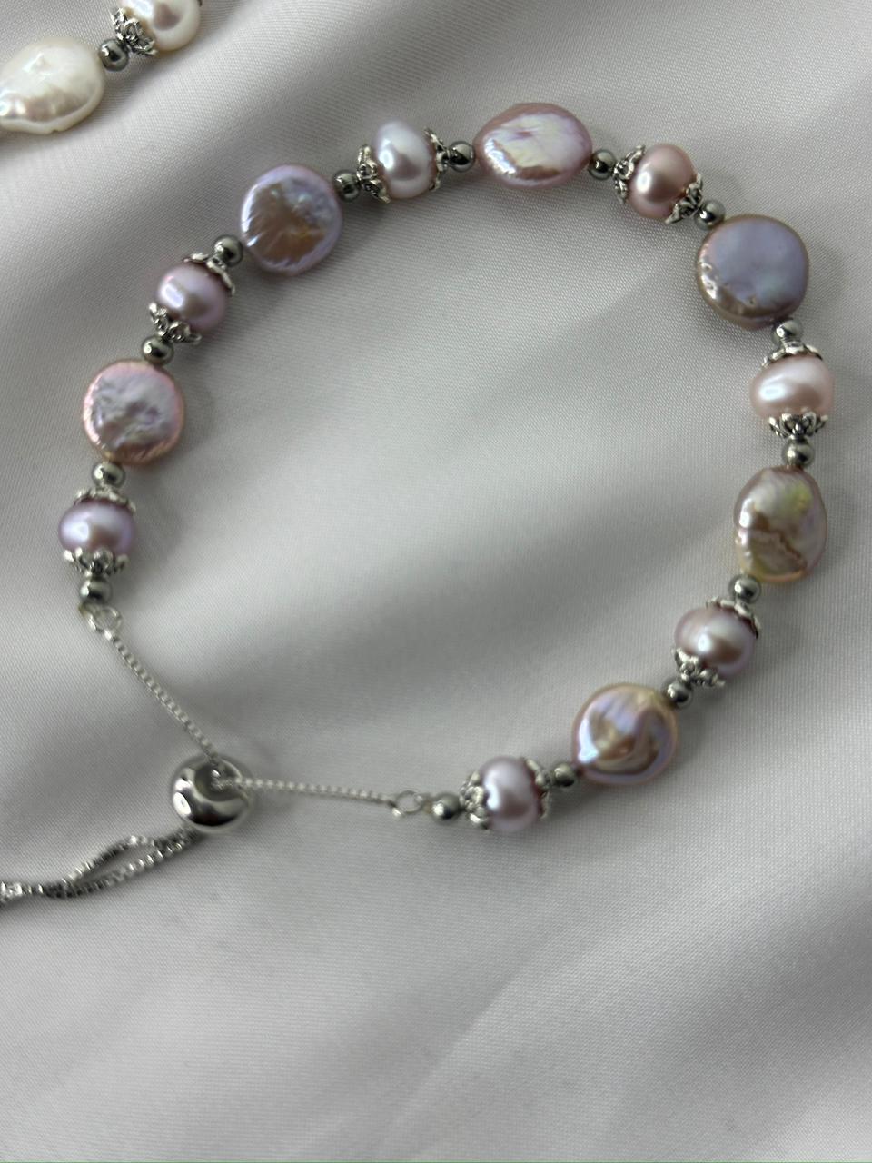 This adjustable pearl bracelet features a beautiful mix of coin pearls and round pearls, creating a balanced design with natural texture and shine. The combination of soft pink and white pearls gives it a graceful look that suits both casual and elegant outfits.