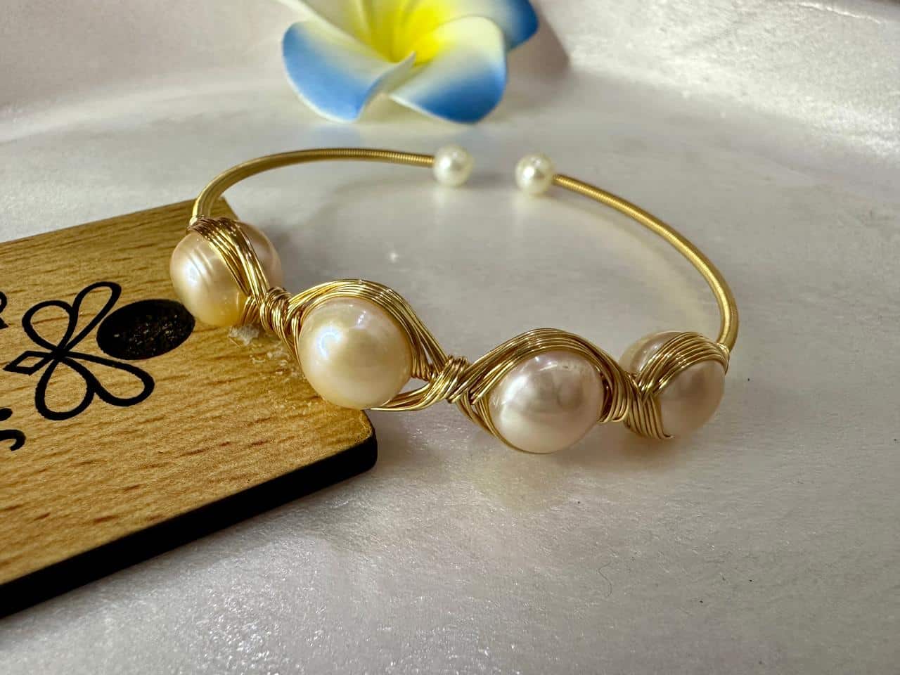Adjustable Freshwater Pearl Bracelet - Gold Coiled Link Flexible DesignAdjustable Freshwater Pearl Bracelet – Gold Coiled Link Flexible Design