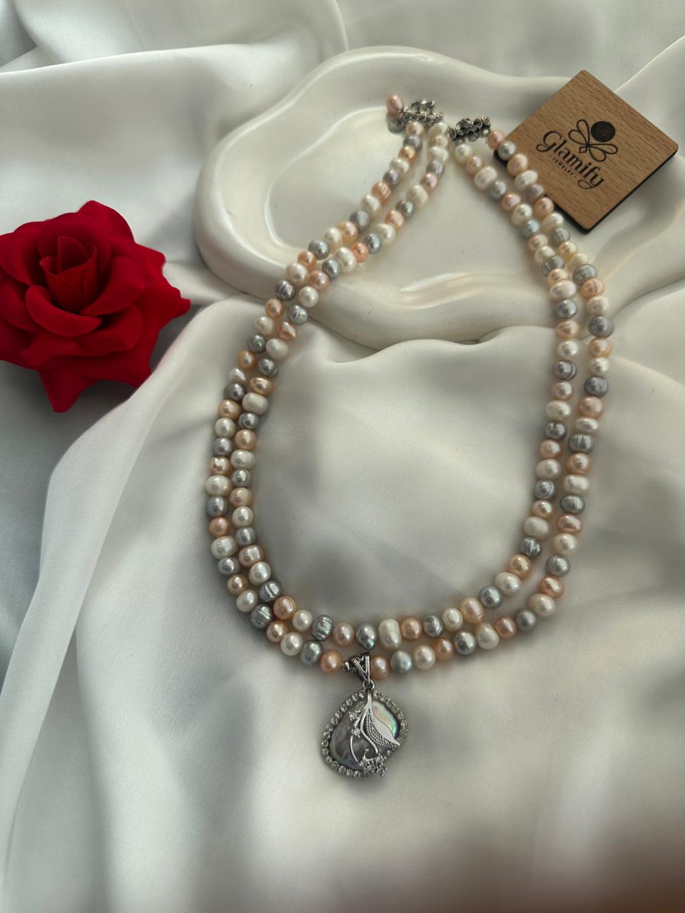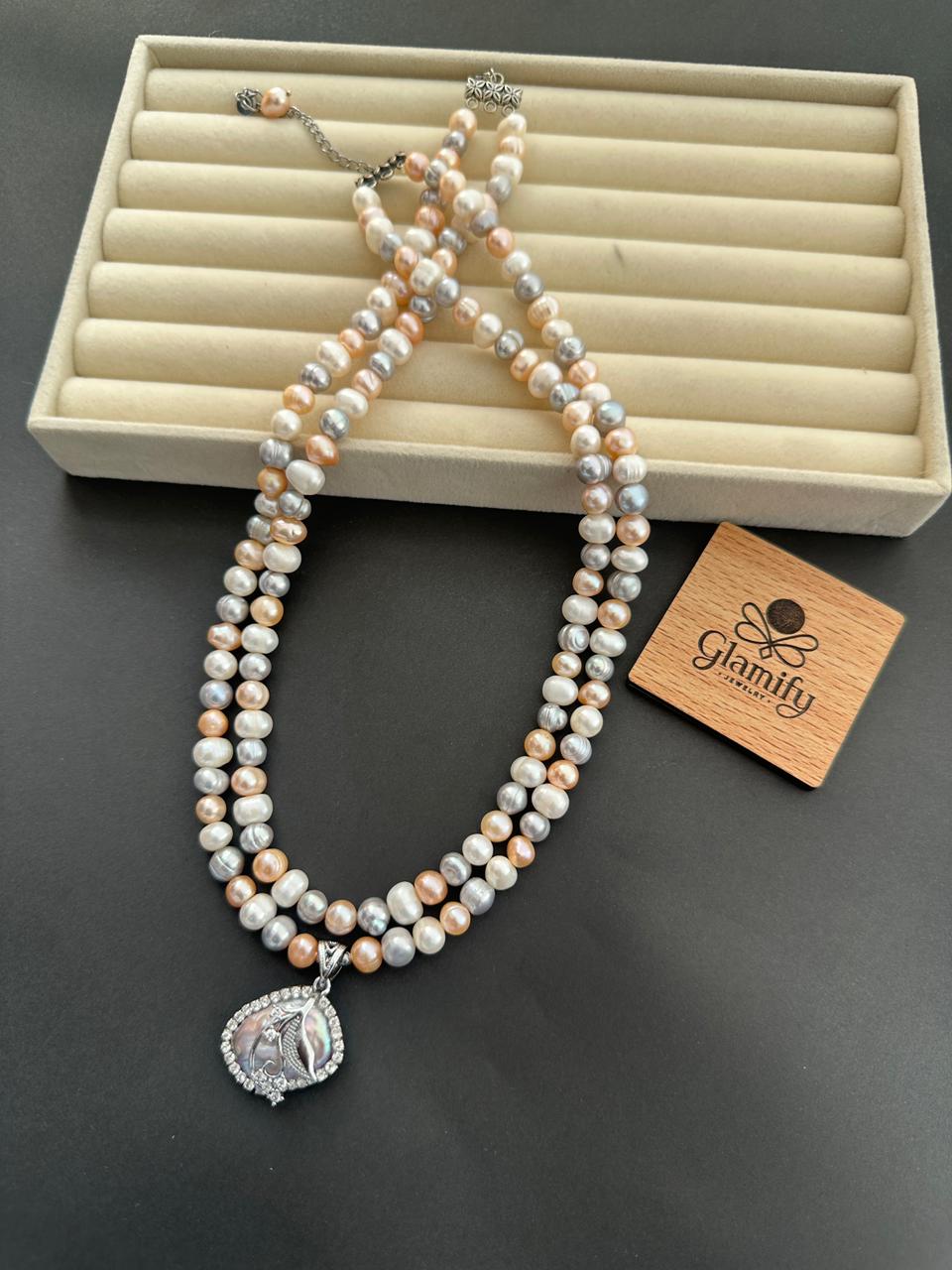 This two-layer freshwater pearl necklace brings together timeless elegance and modern styling. Made with carefully selected 7–8 mm pearls, the necklace features a blend of classic white, soft peach, and silvery grey tones that create a refined and luxurious look.