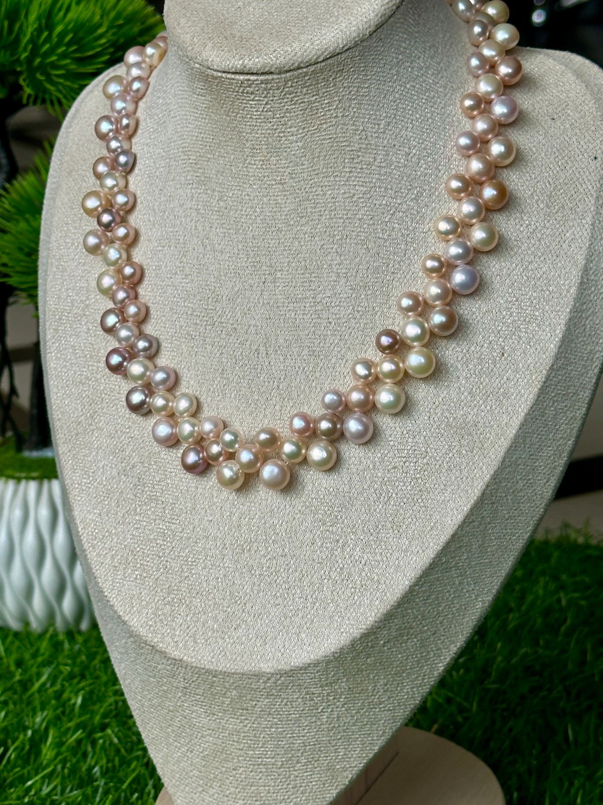 This beautiful layered pearl necklace has two strands of genuine pearls in a mix of soft, natural colors like white, cream, and pink. The pearls are clustered together to create a full, rich look. It’s a gorgeous piece that adds an elegant touch to any outfit.
