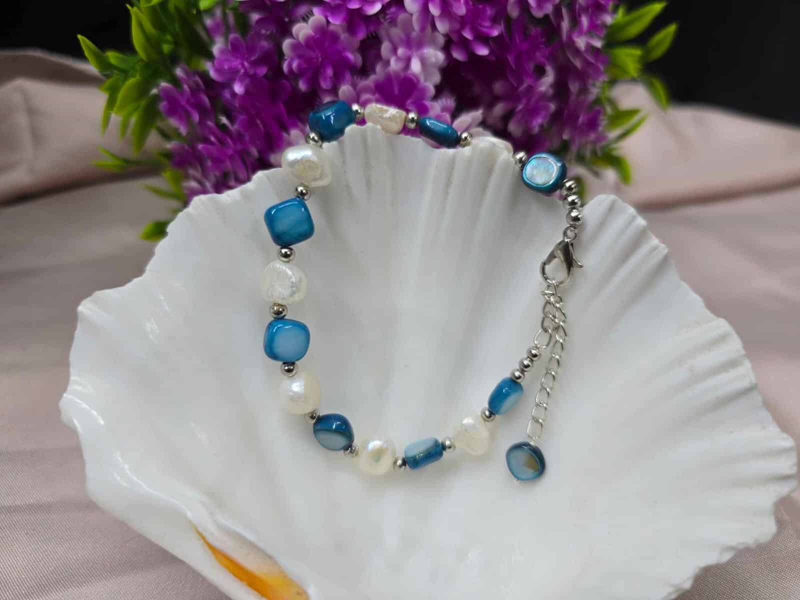 Add a touch of oceanic charm to your wrist with the Freshwater Baroque Pearl & Blue Shell Bracelet from Glamifybd.com. This adjustable bracelet showcases a captivating contrast between the natural, irregularly shaped Baroque Freshwater Pearls and polished, vibrant Blue Shell pieces. The natural iridescence of the shell components creates a stunning shimmer.