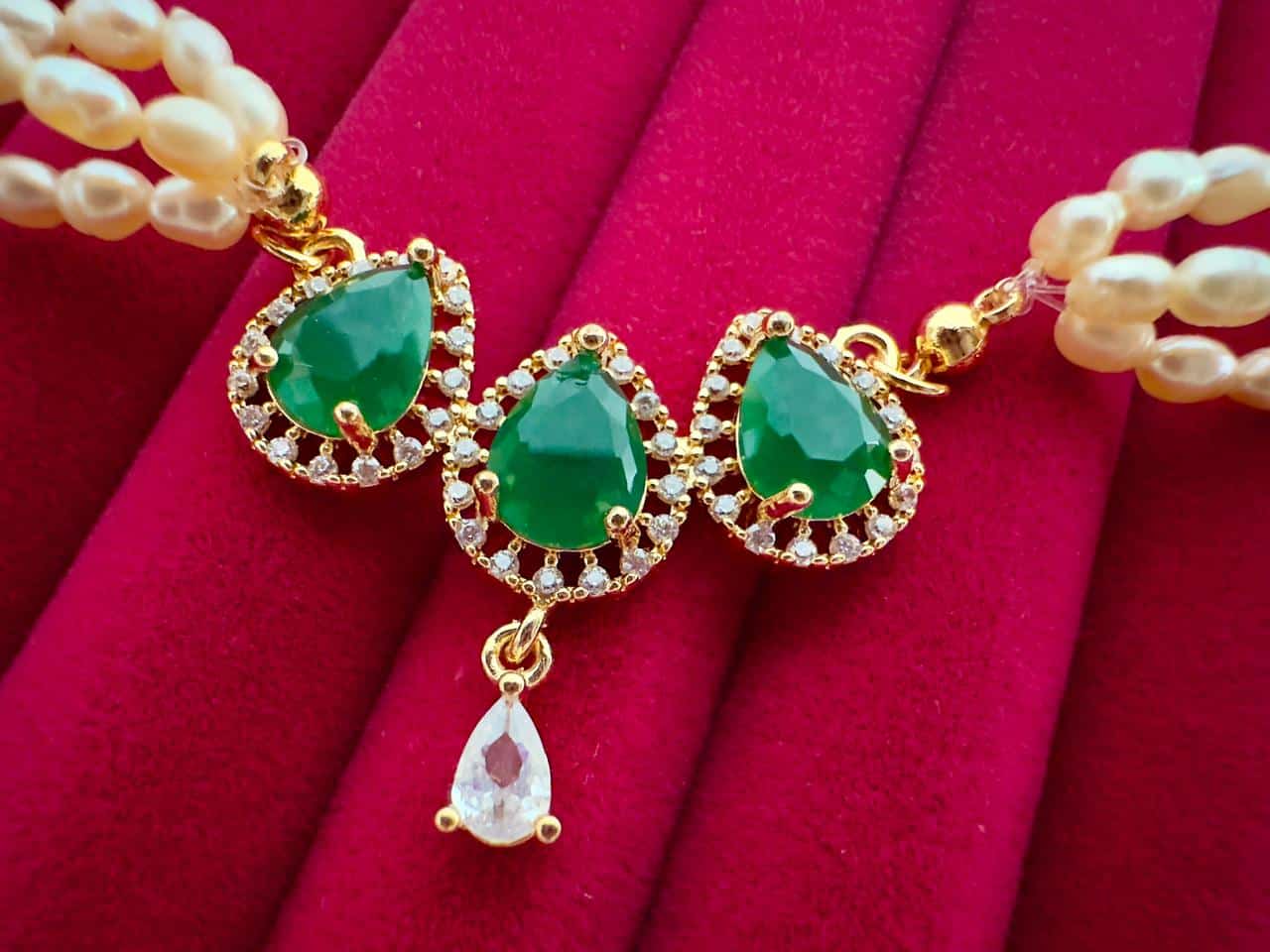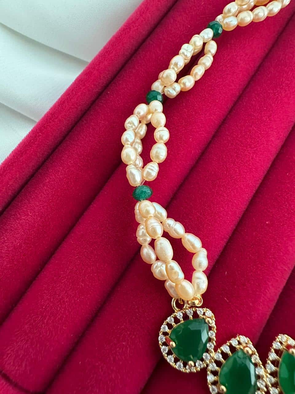 The centerpiece is adorned with three teardrop-shaped emerald-style (Panna) green stones, framed delicately for a luxurious finish. The deep green tone paired with the soft glow of natural pearls creates a timeless combination that complements both traditional and modern outfits.