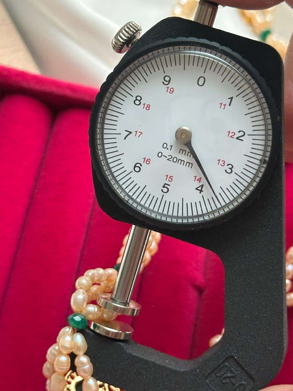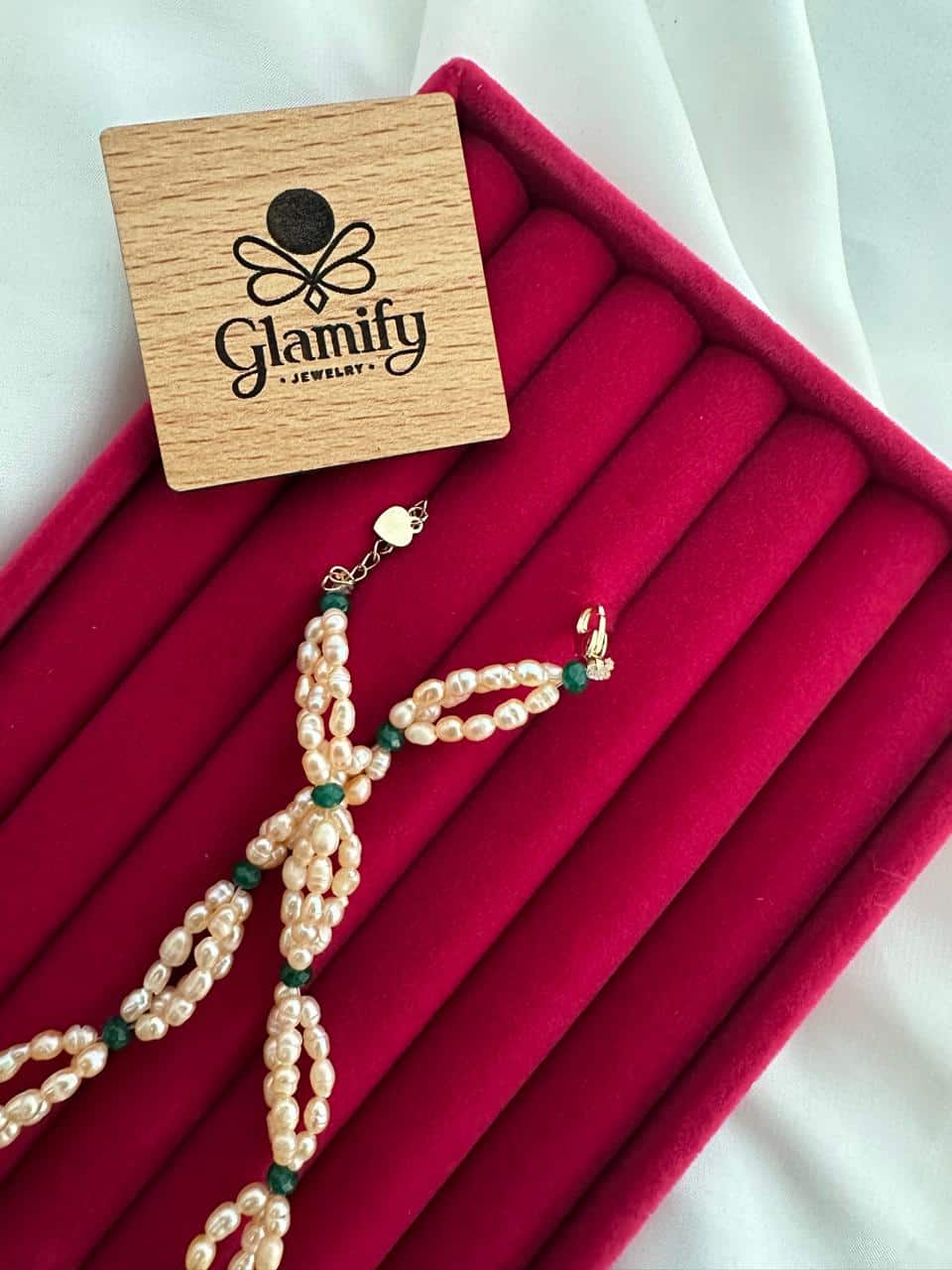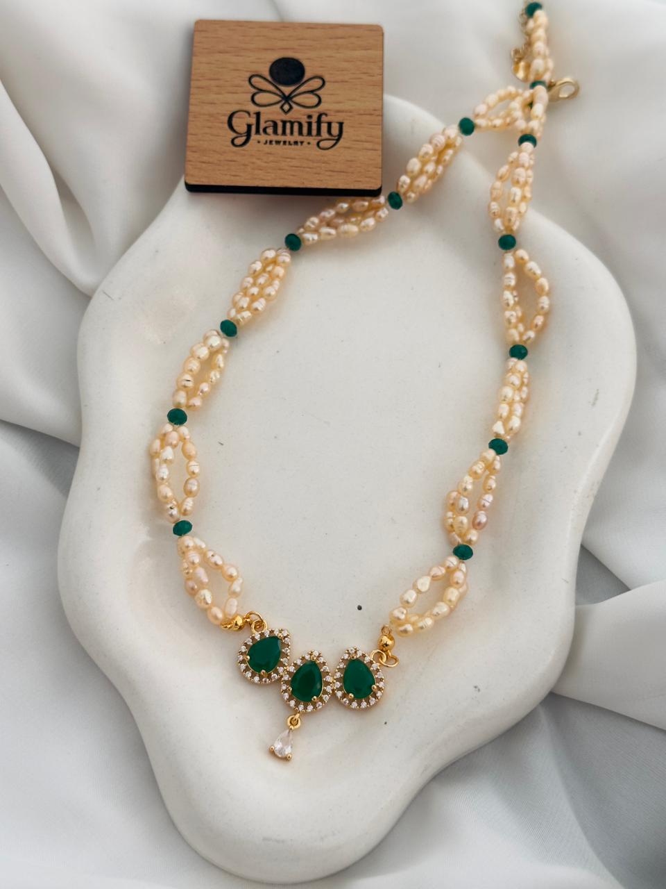 অনন্য উইভিং প্যাটার্ন: মুক্তাগুলোকে একটি বিশেষ প্যাটার্নে হাতে বোনা হয়েছে এবং মাঝে মাঝে ছোট সবুজ বিডস ব্যবহার করা হয়েছে, যা ক্ল্যাসিক পার্ল জুয়েলারিতে একটি ইউনিক টাচ দেয়।