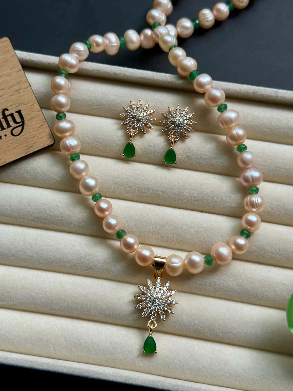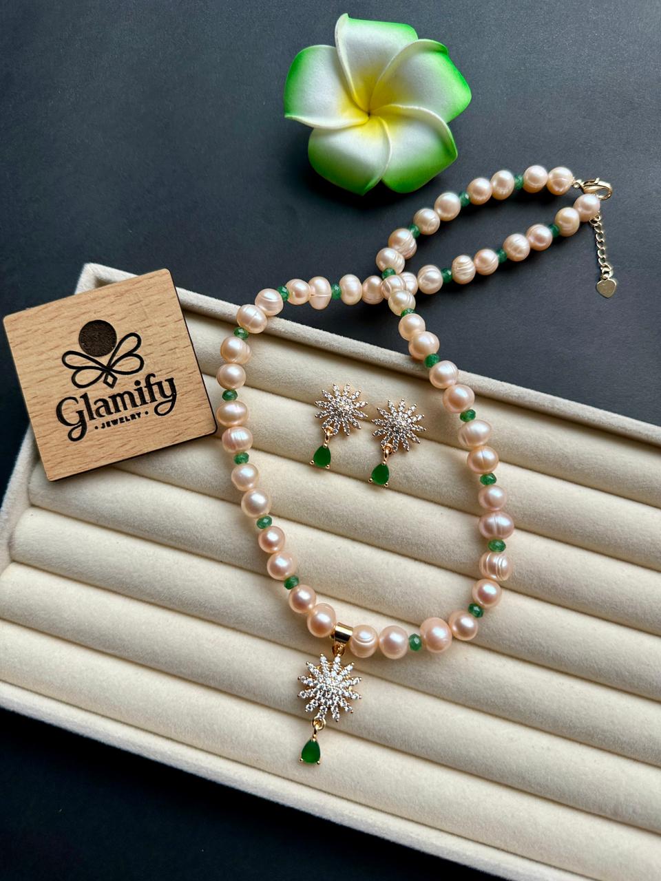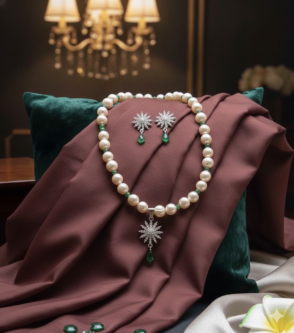 The highlight of this piece is the green stone drop pendant, crafted in a radiant starburst pattern that adds subtle sparkle and sophistication. The soft pink pearls contrast beautifully with the green stone, making this necklace ideal for both traditional and western outfits.