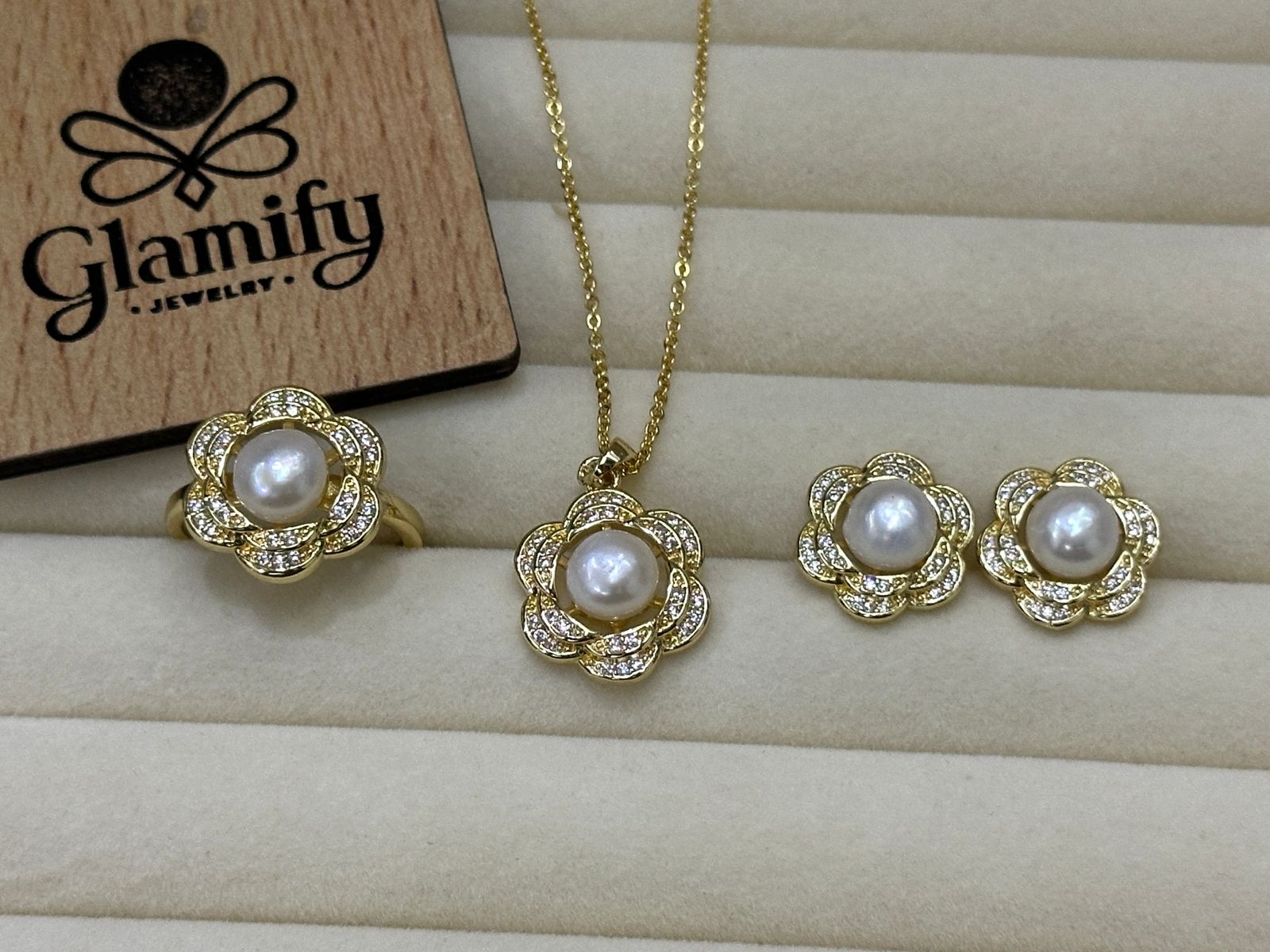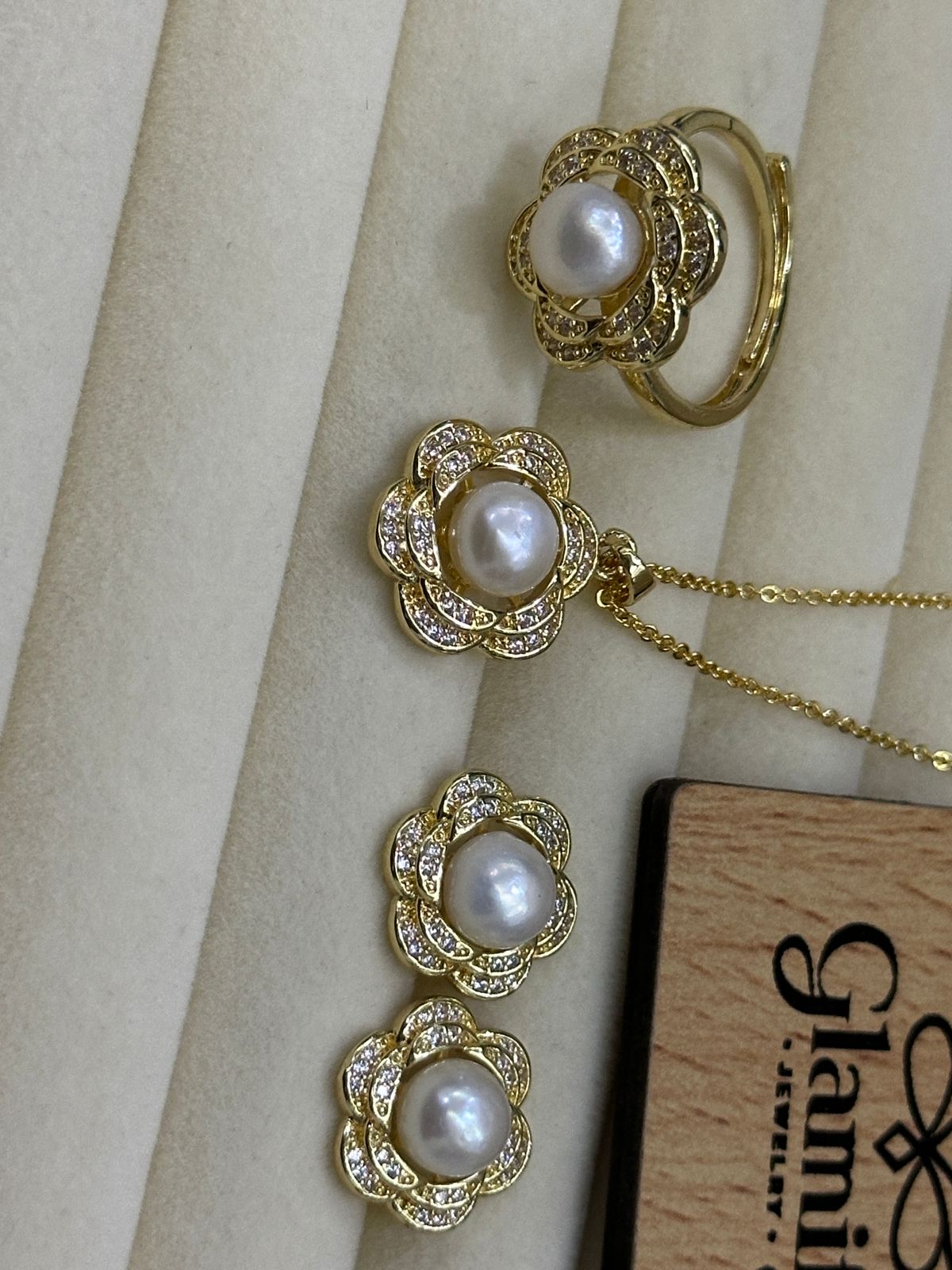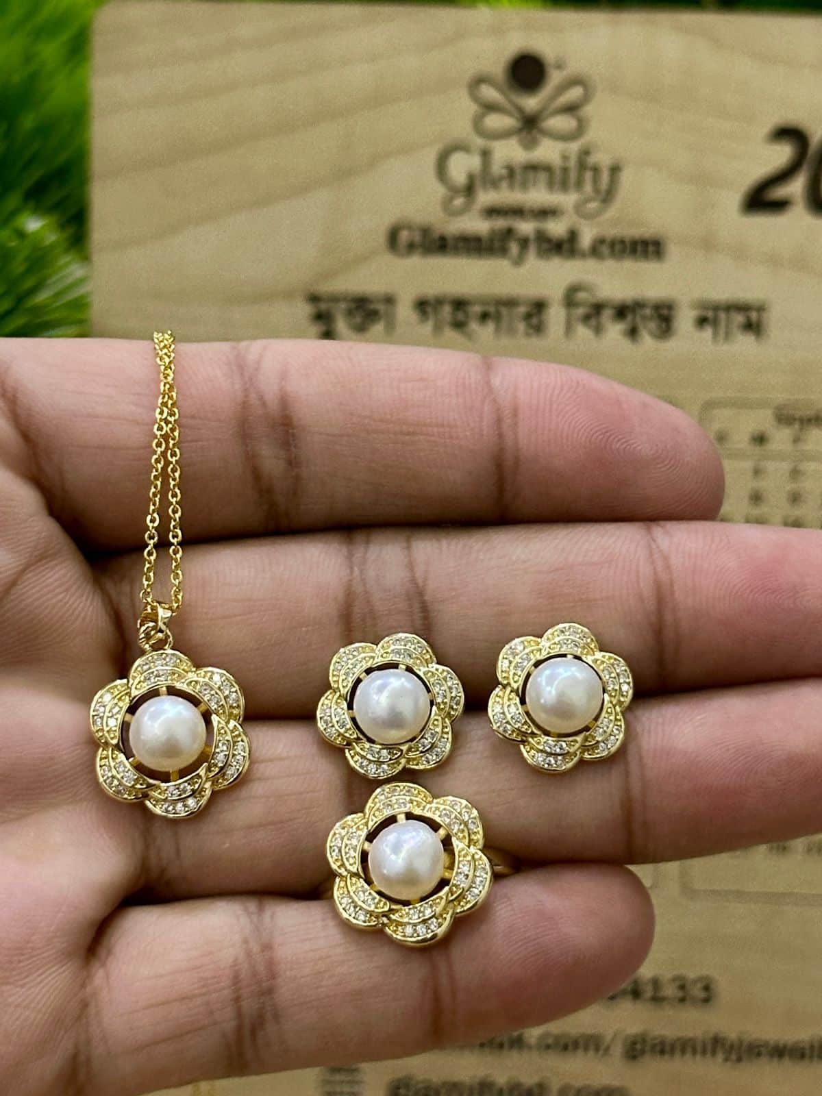Adorn yourself with the enchanting Gold-Tone Floral Pearl Pendant Set from Glamifybd.com. This luxurious set is designed to bring a touch of sparkle and natural elegance to your look. Each piece features a beautiful central pearl, meticulously set within an intricate floral design accented with shimmering small stones. The rich gold-tone finish enhances the natural radiance of the pearls and the brilliance of the accents.