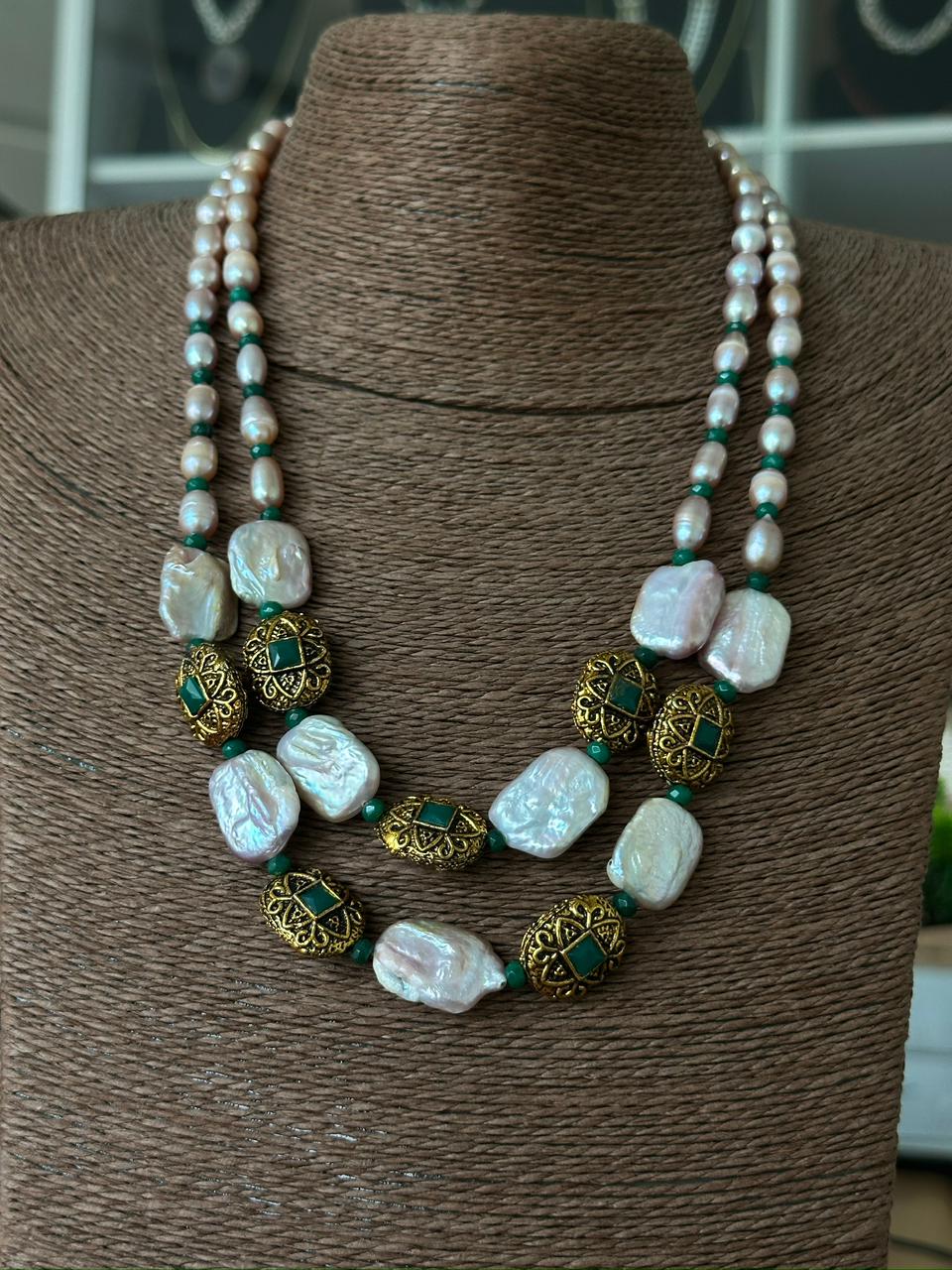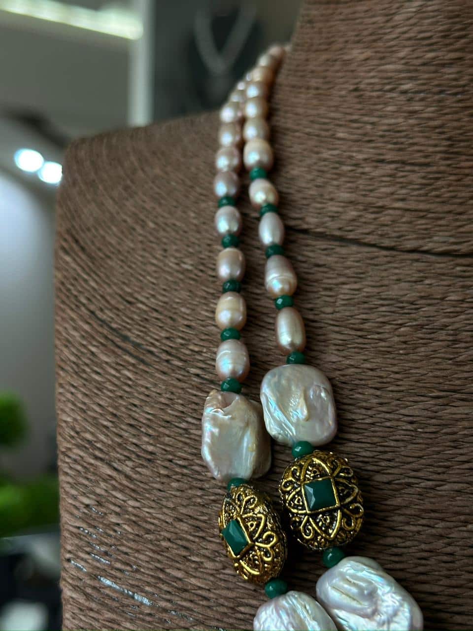 This two-layer pearl necklace set is made with natural baroque pearls/Rice Pearl and gold-plated beads/Panna Stone or red stone detailing. It has an adjustable dori for size fitting and comes with matching pearl earrings.