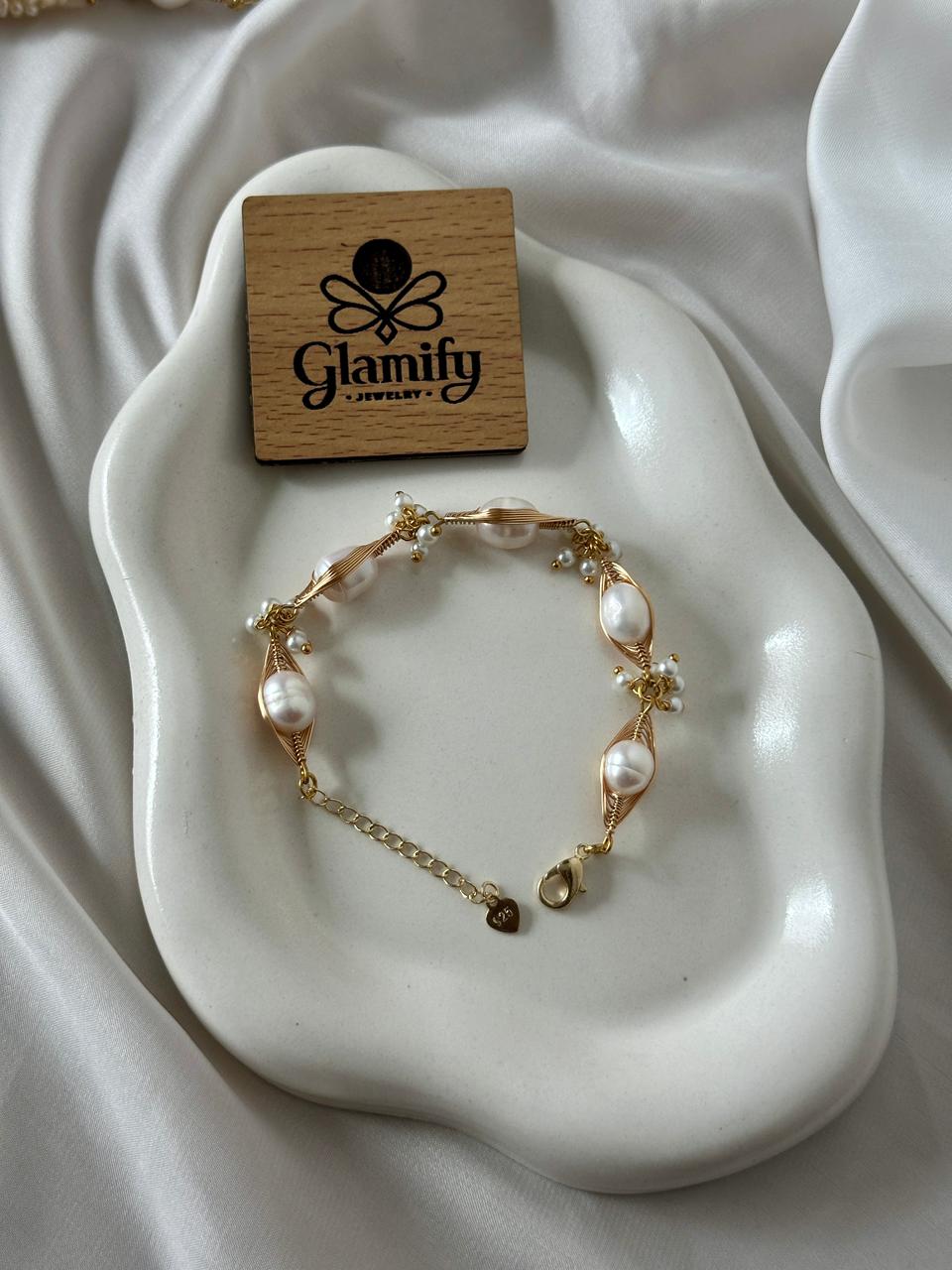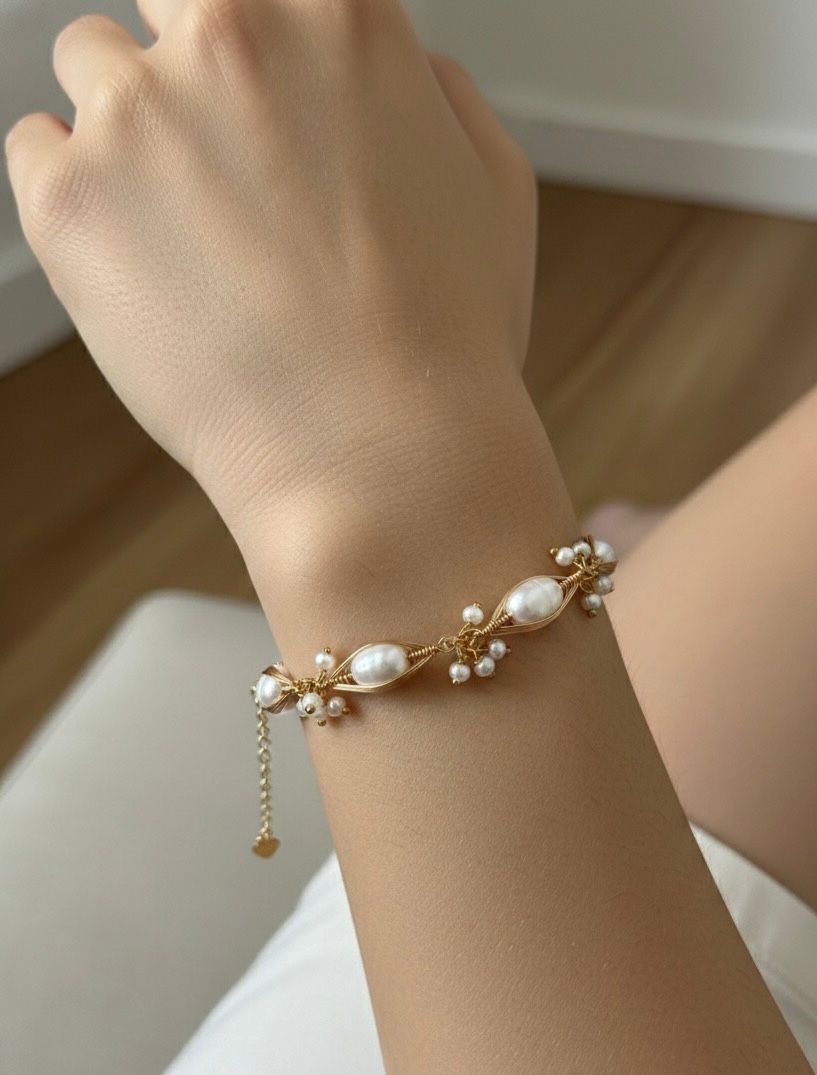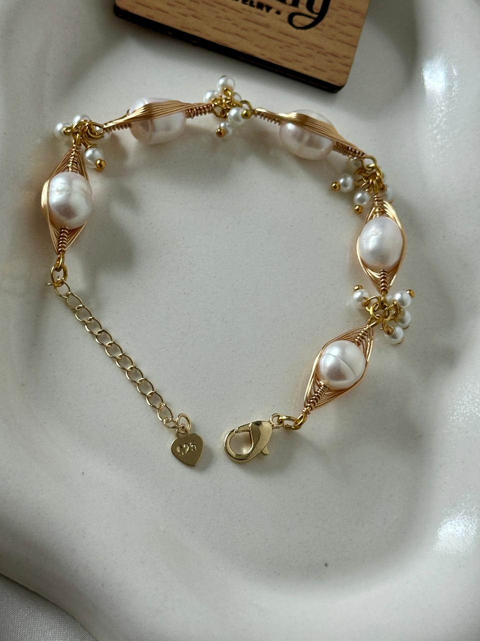 This handcrafted freshwater pearl bracelet adds a soft and elegant touch to any outfit. Each pearl is wrapped with fine gold-toned wire, creating a unique design that stands out effortlessly. The bracelet features smooth oval pearls paired with tiny white pearl clusters, giving it a graceful and feminine look.