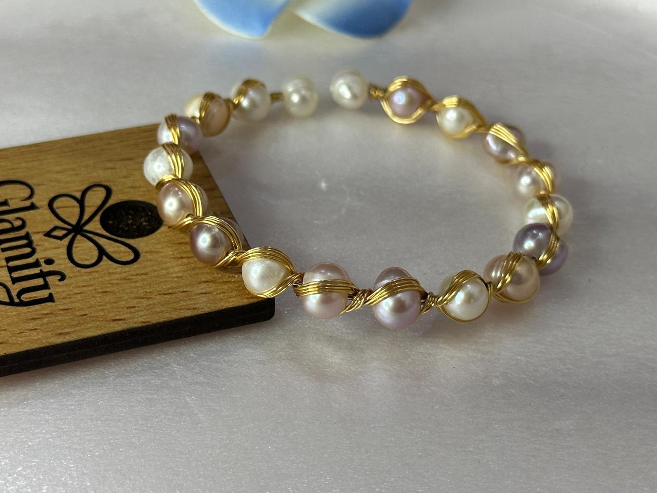 Add a distinctive accessory to your collection with this handcrafted multicolor pearl bracelet. This piece moves away from standard stringing methods, utilizing an intricate gold wire-wrapped technique to connect each pearl, creating texture and flexibility. The pearls themselves are genuine freshwater with natural color variations, showcasing shades of soft white, rosy pink, and light purple/lavender.