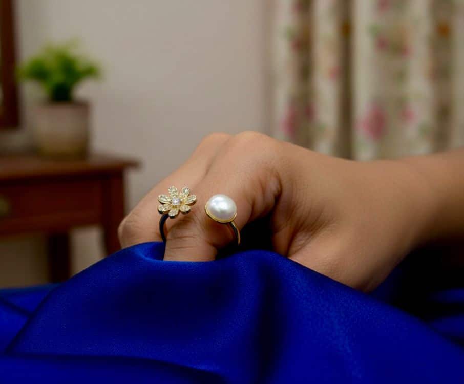 This beautiful gold-tone adjustable ring has a shiny, open design. One side has a glowing white pearl, and the other side has a delicate flower  covered in tiny, sparkling stones. It’s a sweet and stylish ring that fits any finger.