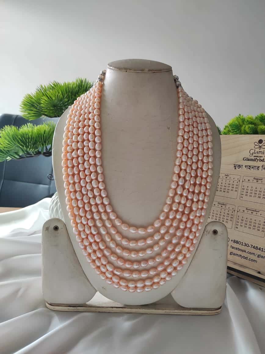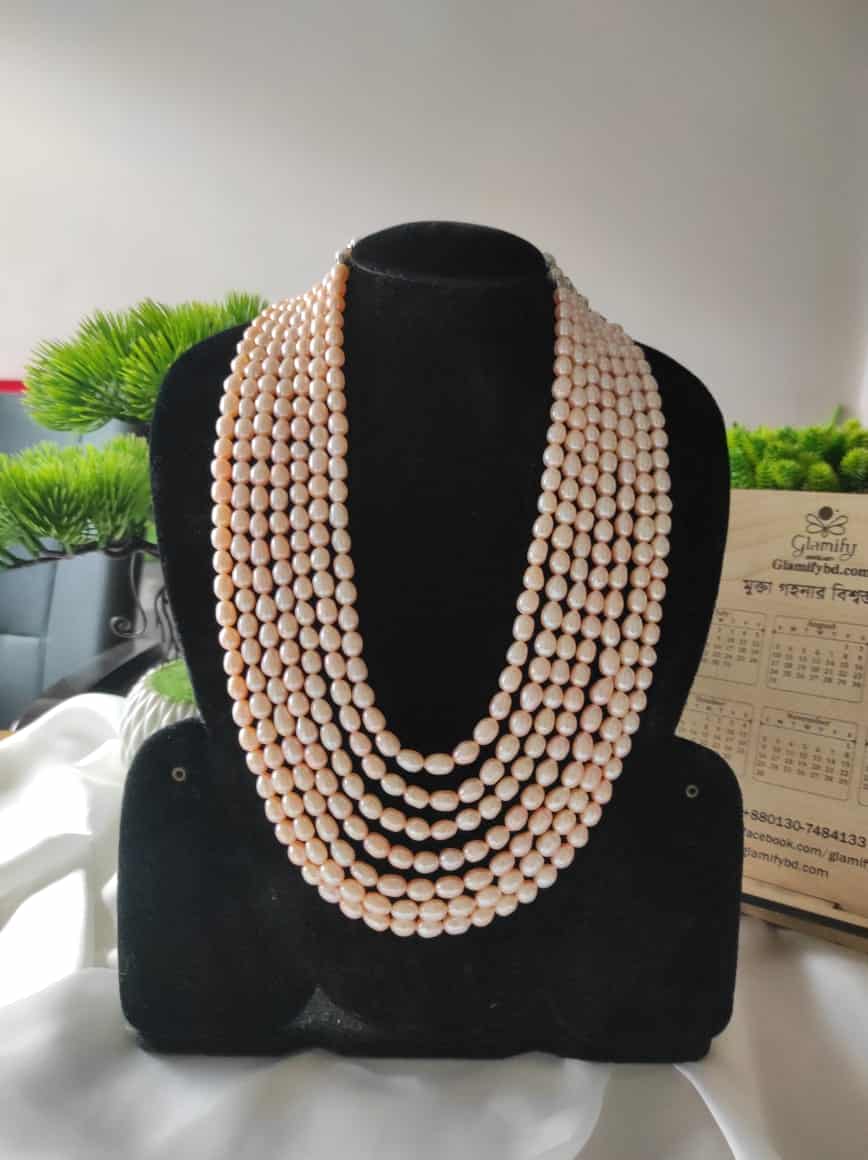 This Original AAA Freshwater Pink Rice Pearl Necklace is designed for women who love graceful luxury with a bold presence. Made with carefully selected 7–8mm freshwater rice pearls, the necklace features a stunning 7-layer design that creates depth, elegance, and a rich visual appeal.