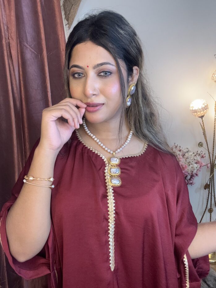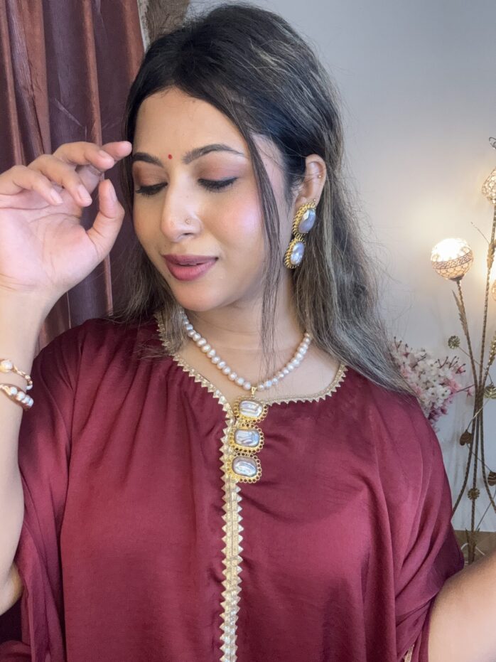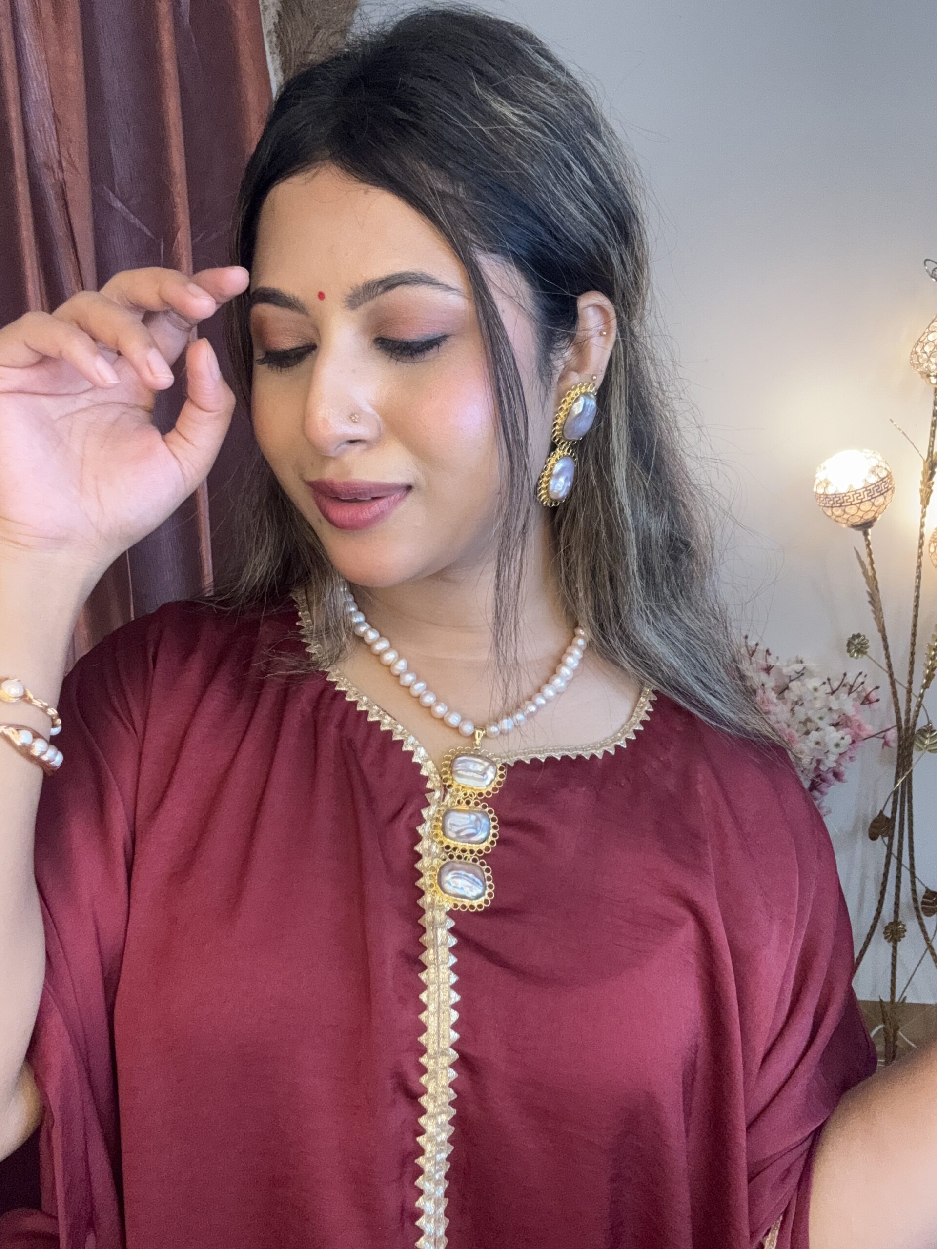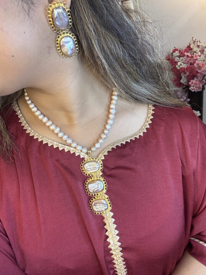 The necklace features carefully selected 7mm pearls that create a neat and refined look around the neckline. The highlight of this set is its beautifully crafted triple-tier drop pendant, designed with mother pearl detailing that reflects light in soft, elegant tones. The gold plated frame adds a rich finish, making the design stand out effortlessly.