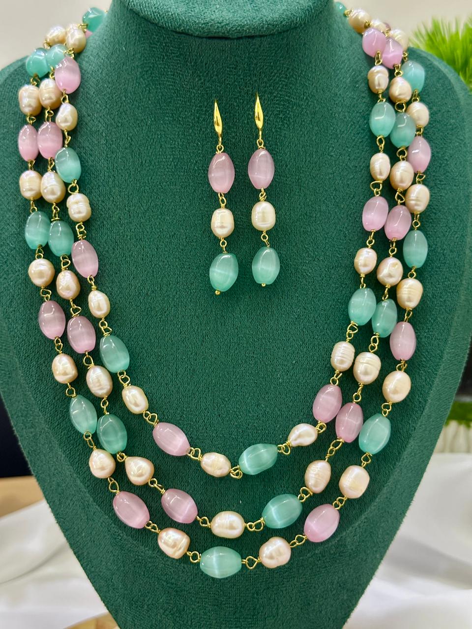 Stunning multi-strand pearl necklace set featuring three luxurious layers of pink and green semi-precious stones and authentic freshwater pink pearls. Comes complete with matching drop earrings. A versatile, elegant statement piece for any occasion. Perfect for adding a touch of sophisticated color to your wardrobe.