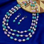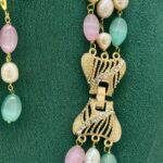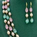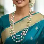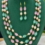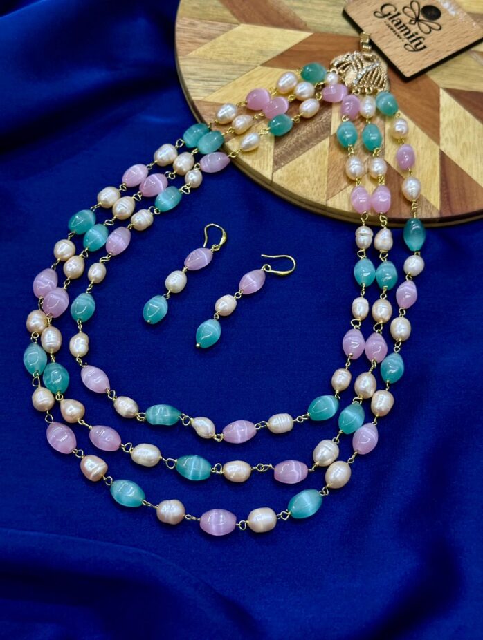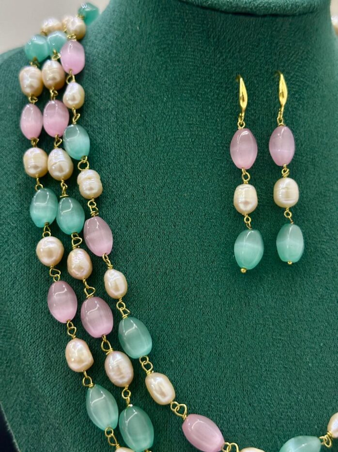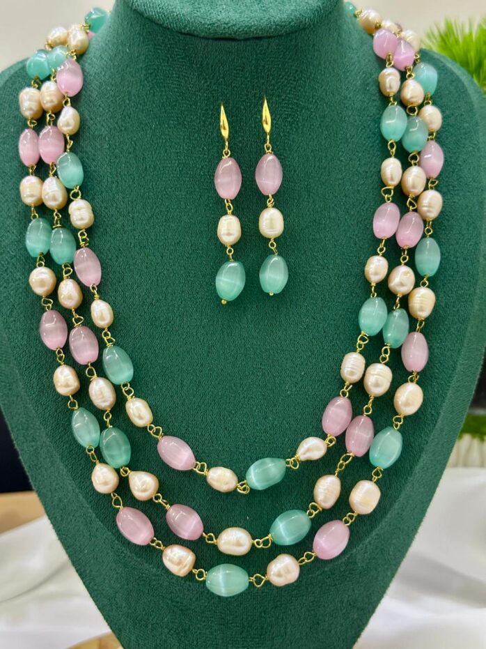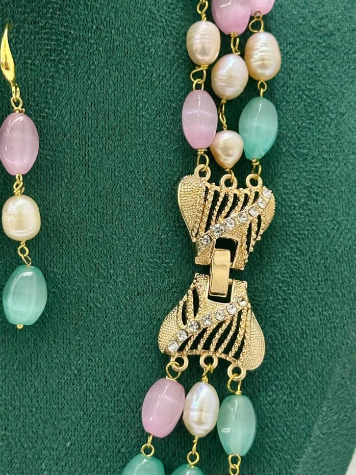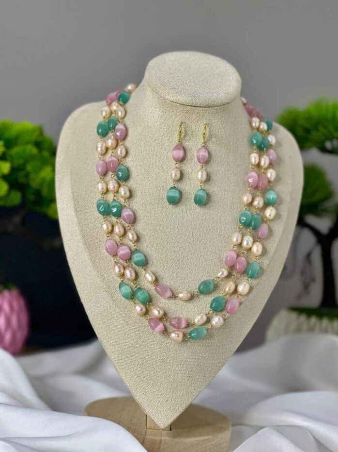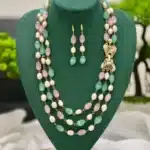 গোলাপী মুক্তা এবং হালকা সবুজ পাথরের এই স্নিগ্ধ কম্বিনেশন যেকোনো প্যাস্টেল কালার বা ফ্লোরাল শাড়ির সাথে দারুণ মানিয়ে যায়। বিয়ের অনুষ্ঠান বা জমকালো পার্টিতে নিজেকে ট্রেন্ডি এবং সোপিস্টিকেটেড লুকে ফুটিয়ে তুলতে এই থ্রি-লেয়ার সেটটি সেরা পছন্দ।
