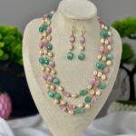 Pink Green Stone & Pearl 3-Layer Necklace Set