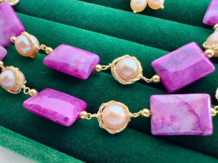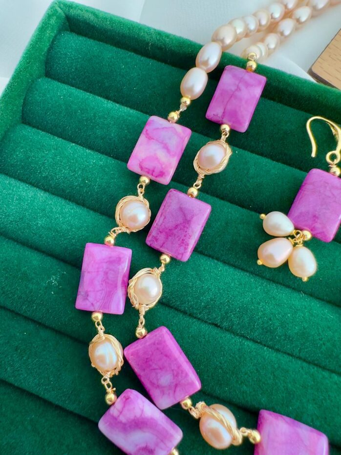 The necklace features vibrant rectangular pink/magenta agate stones arranged gracefully in a double-layer design, creating a luxurious and modern look. Between the stones, 6mm high-quality rice pearls add softness and natural shine, balancing bold color with classic elegance.