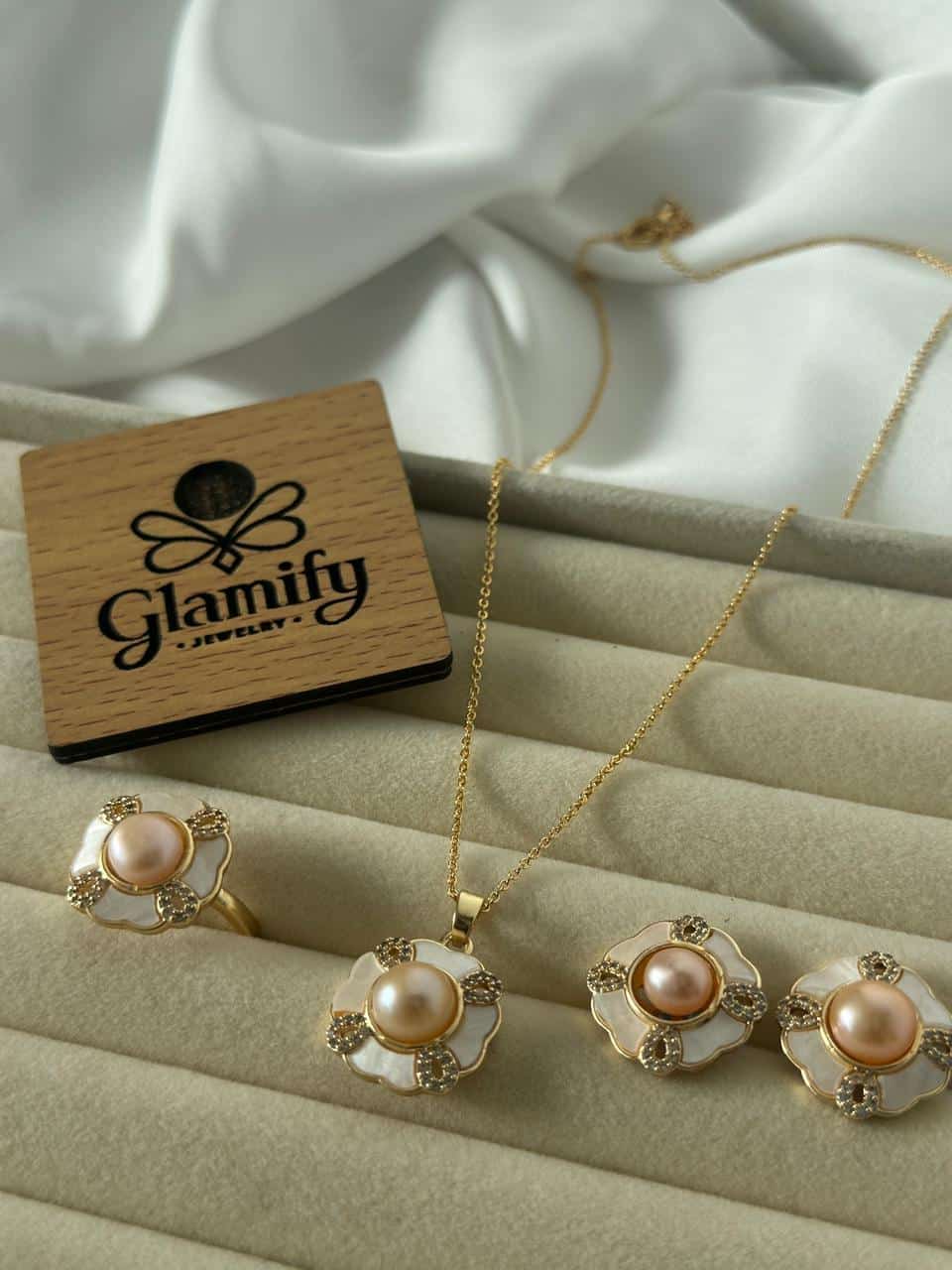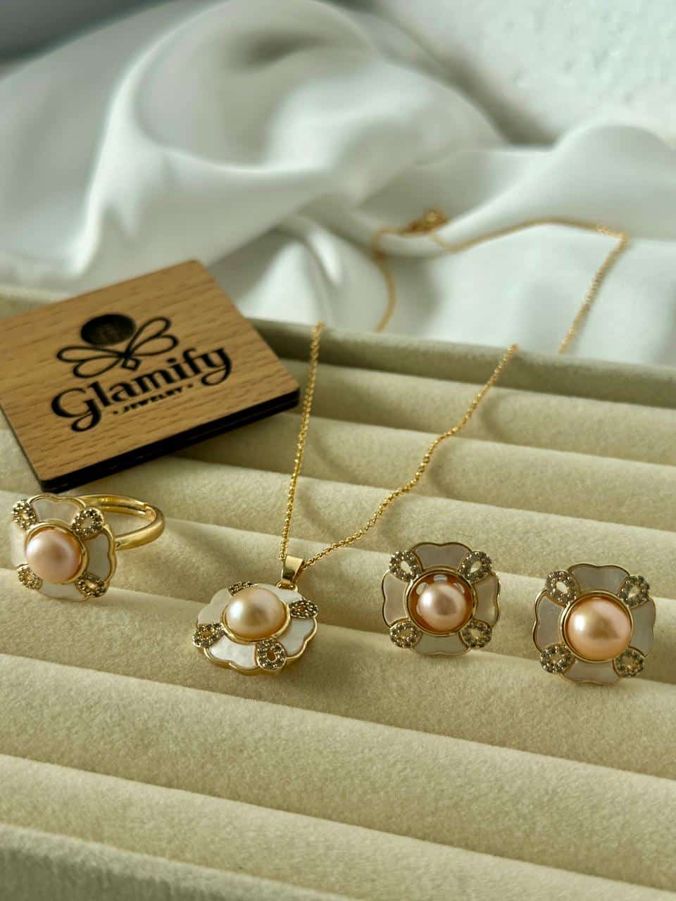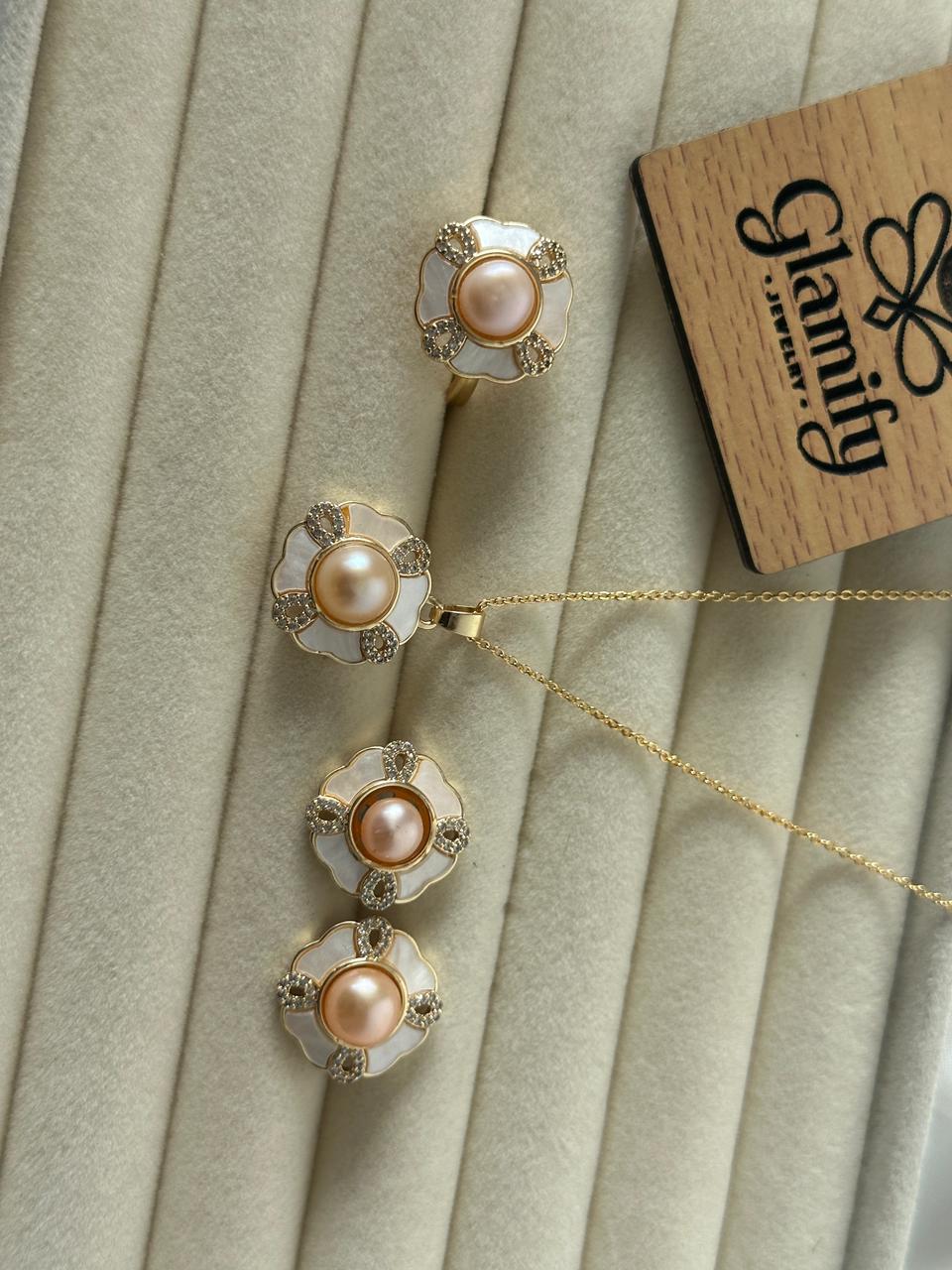 গ্লসি পিঙ্ক পার্ল ও এনামেল ডিজাইন: ঝকঝকে গোলাপি মুক্তার চারপাশে সাদা এনামেলের পাপড়ি এবং পাথরের কারুকাজ সেটটিকে দিয়েছে এক অসাধারণ প্রিমিয়াম লুক.