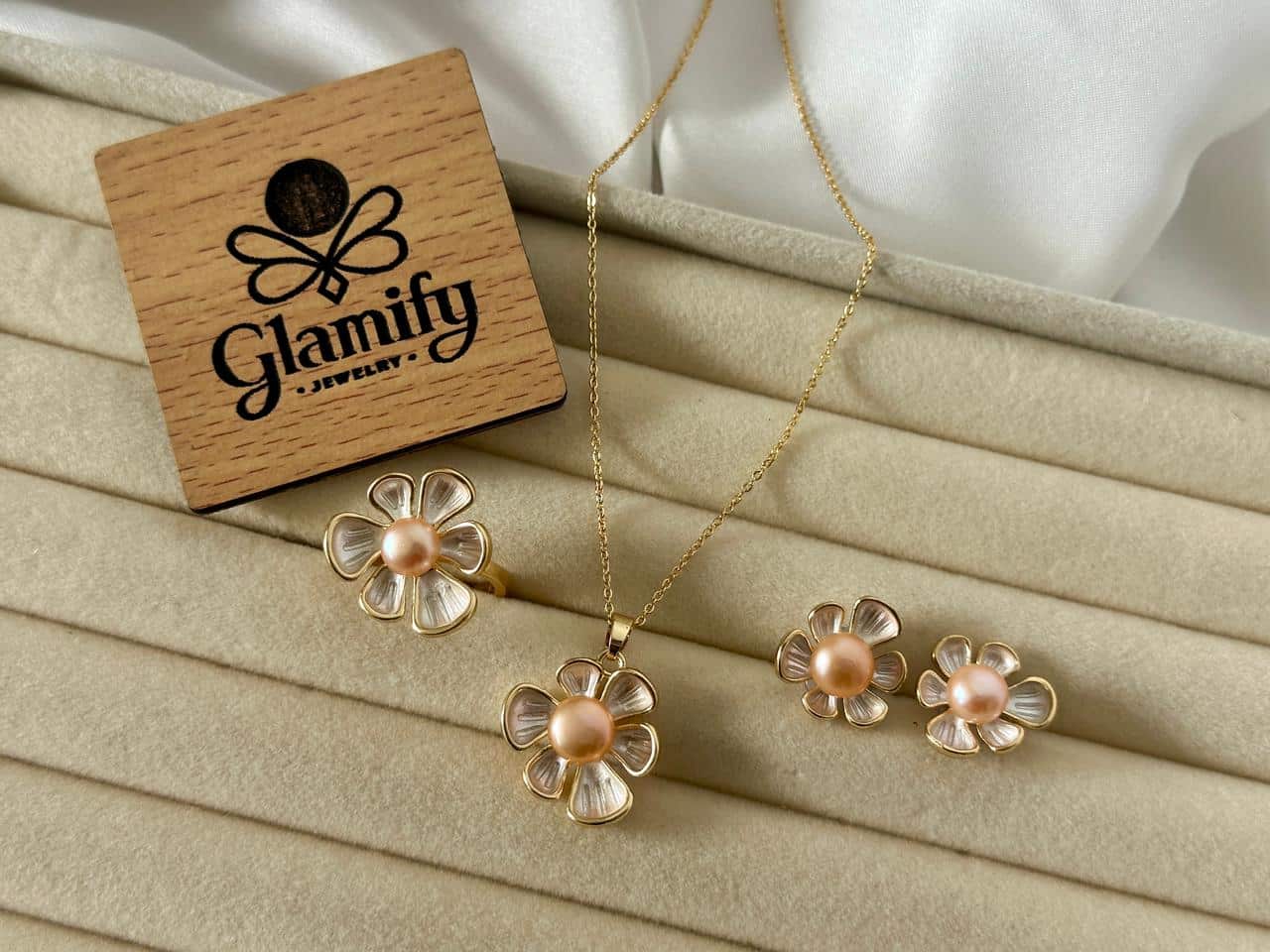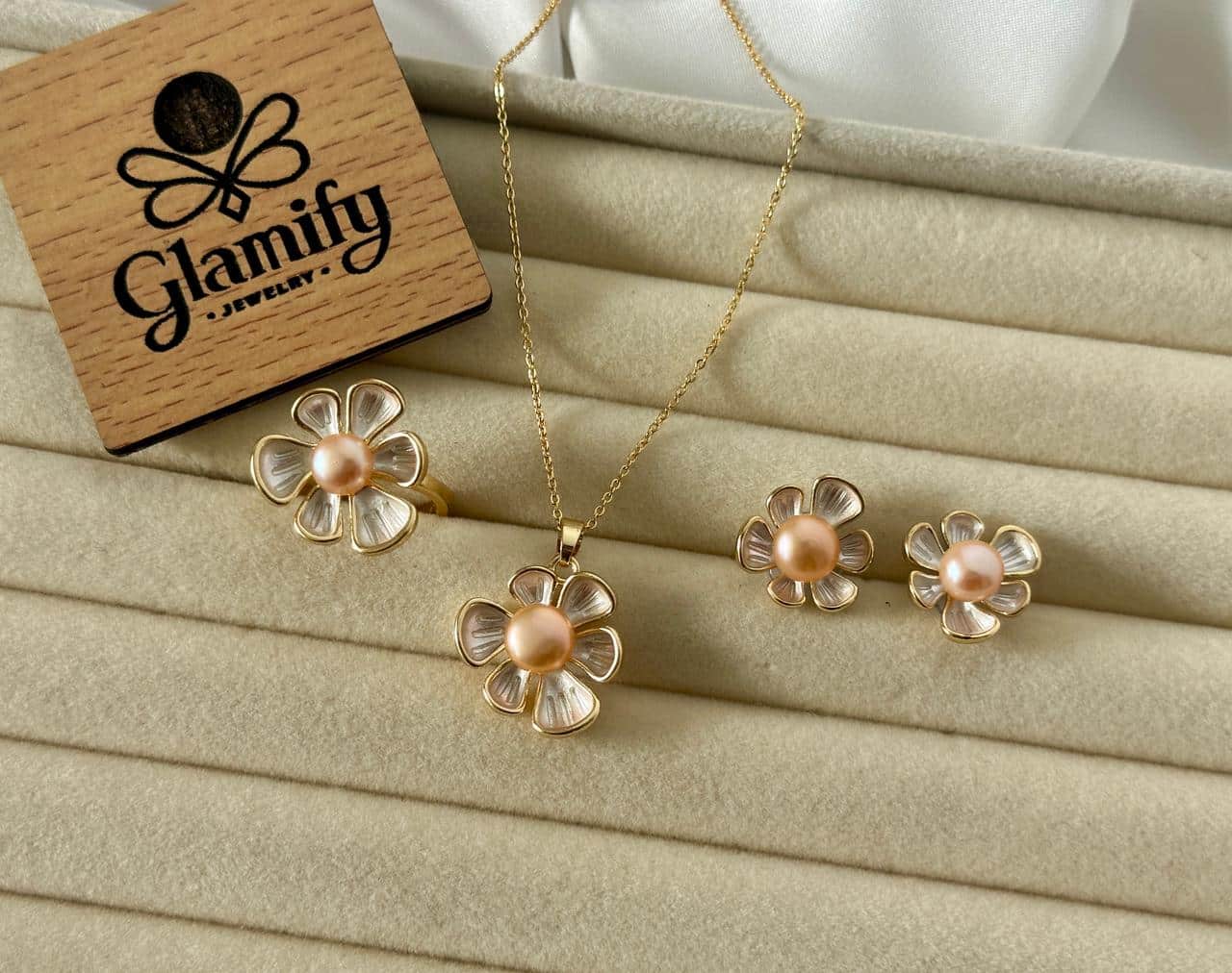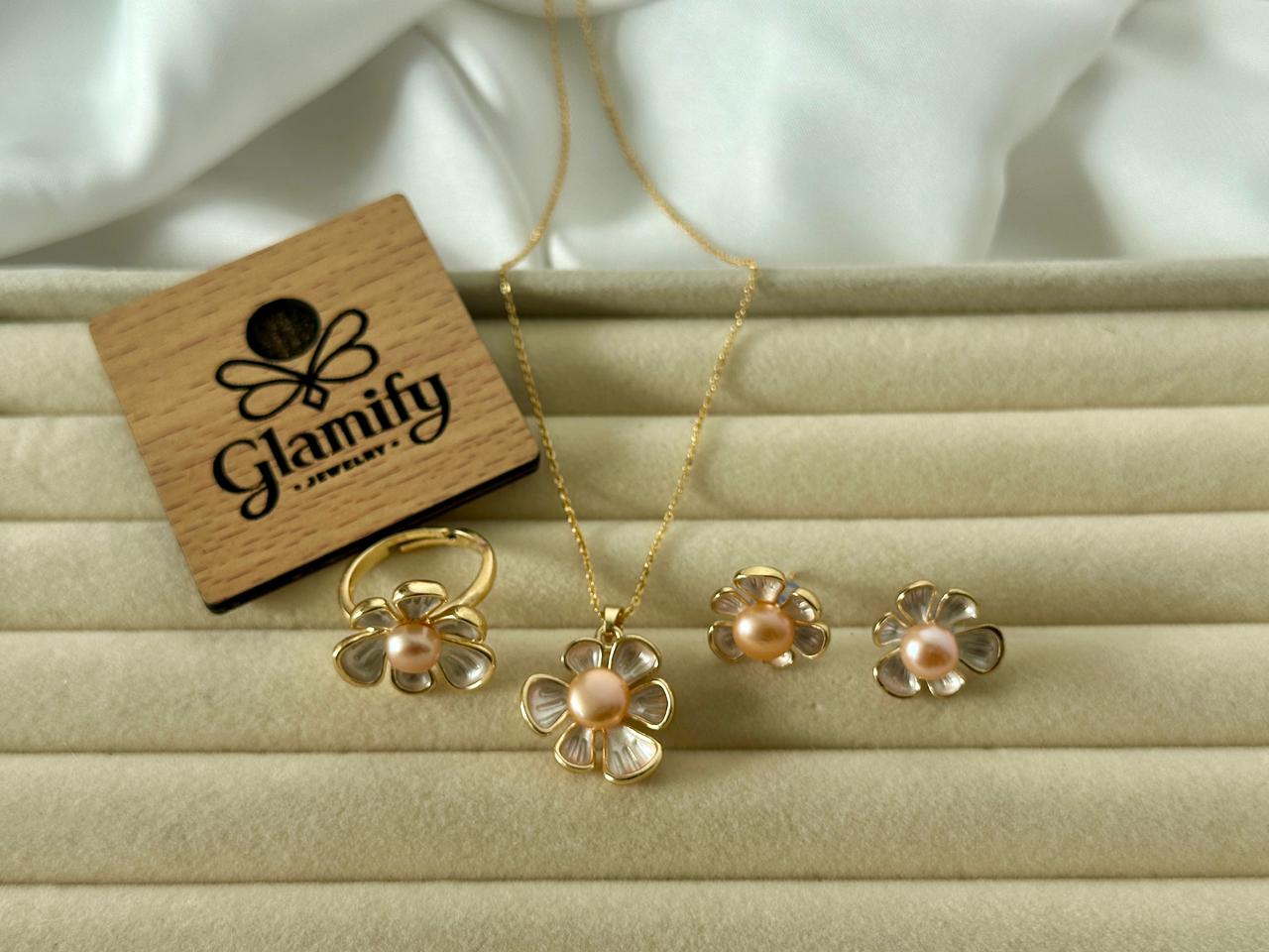 Bring a fresh and charming look to your jewelry collection with this Pink Pearl Flower Pendant Set. Designed with a unique five-petal flower pattern, each piece carries a soft pink pearl at the center, highlighting a delicate and feminine style.