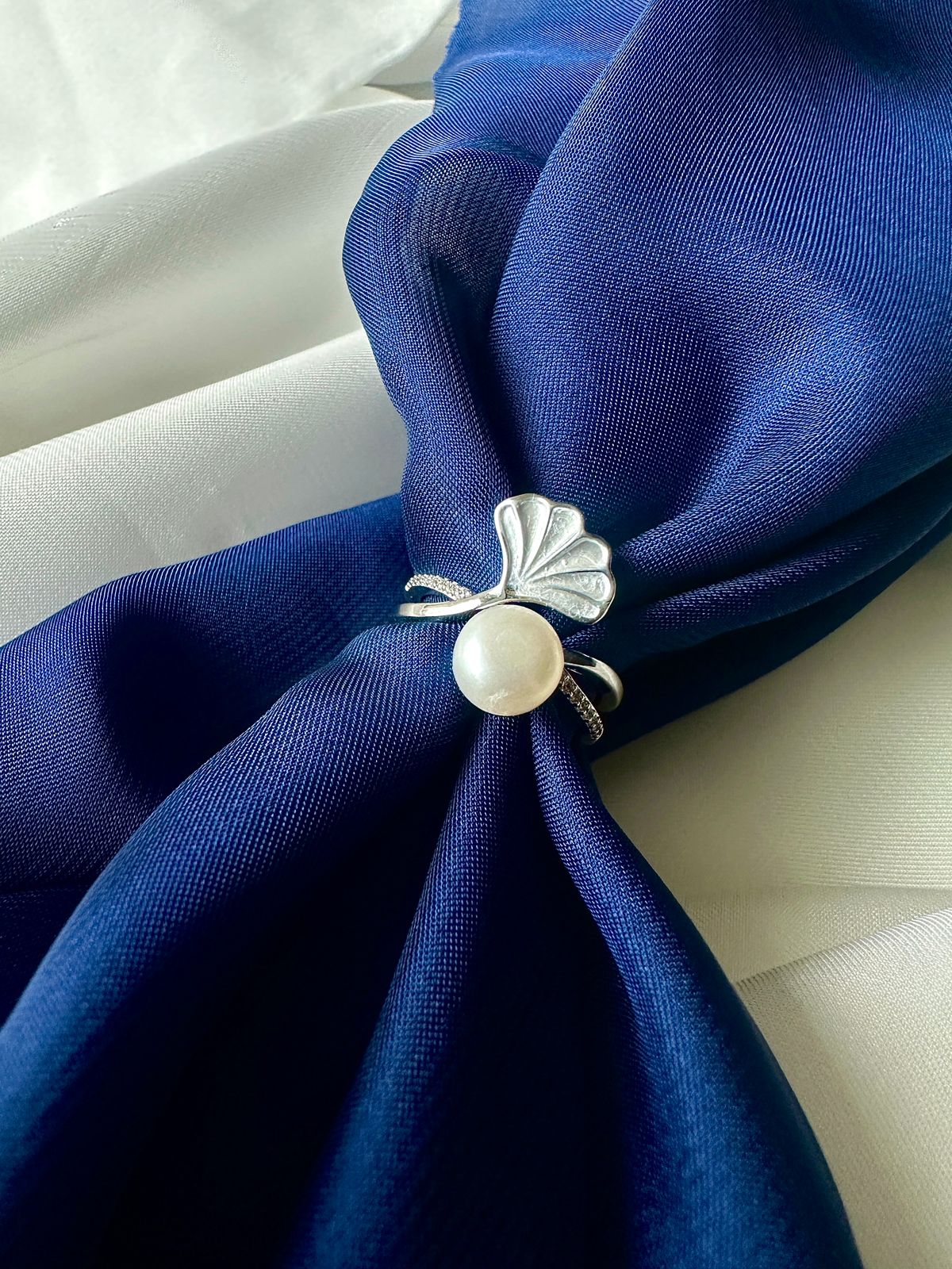 The band of this ring is what makes it truly special. It’s made of a shiny, silver-tone metal that splits into two parts. On one side, there’s a delicate, fan-like shape that looks just like a Ginkgo leaf 🌿, a symbol of hope and longevity. The leaf has a smooth, layered texture that catches the light beautifully. On the other side of the pearl, the band is decorated with a line of tiny, glittering stones that add a touch of sparkle and elegance. The contrast between the smooth pearl, the unique leaf, and the shimmering stones is what makes this ring so magical.