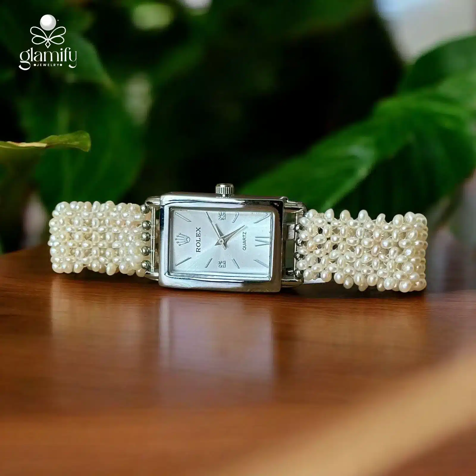 Rolex-Inspired Rectangular Pearl Strap WatchRolex-Inspired Rectangular Pearl Strap Watch