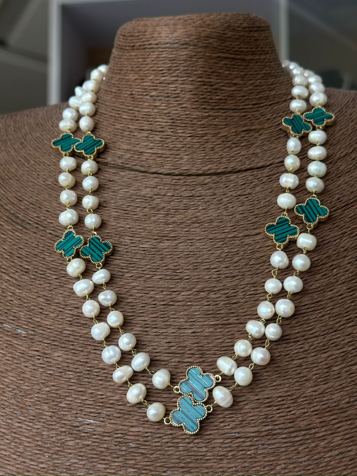 Royal Double-Layer Pearl Necklace w/ Green Clover Stones