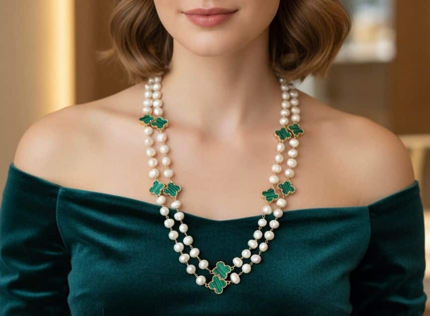 What sets this design apart is the incorporation of striking green clover-shaped stones, framed with a delicate gold-tone border. These stones, which closely resemble the sought-after Malachite-effect (or high-quality Malachite-look Chalcedony), offer a bold, ট্র্যাডিশনাল এবং ট্রেন্ডি (Traditional and Trendy) contrast to the white pearls, guaranteeing an absolutely unique and expensive appearance.