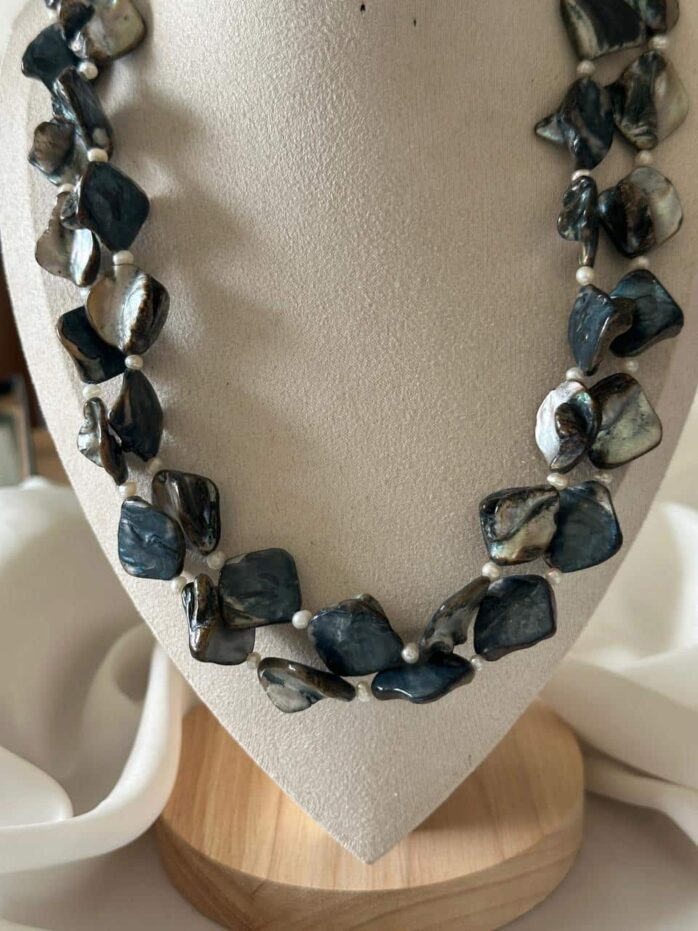 This long necklace features beautifully shaped uncut shell pearls, giving each piece a natural, organic character. The irregular shell design creates a rich textured look, making it stand out from regular pearl necklaces. Between each shell pearl, delicate 3mm mini round pearls are added to bring softness and balance to the design.