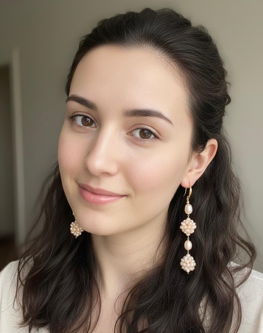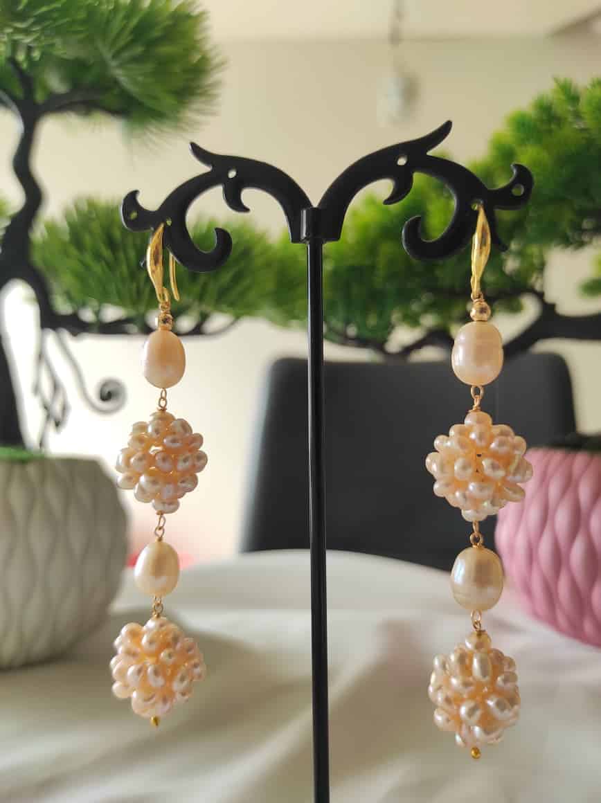 These handcrafted soft pink pearl earrings bring together a graceful blend of elegance and comfort. Each pair is made using high-quality freshwater pearls in a natural soft pink shade. The design features oval rice-shaped pearls paired with finely arranged small pearls, forming two beautifully detailed clusters.
